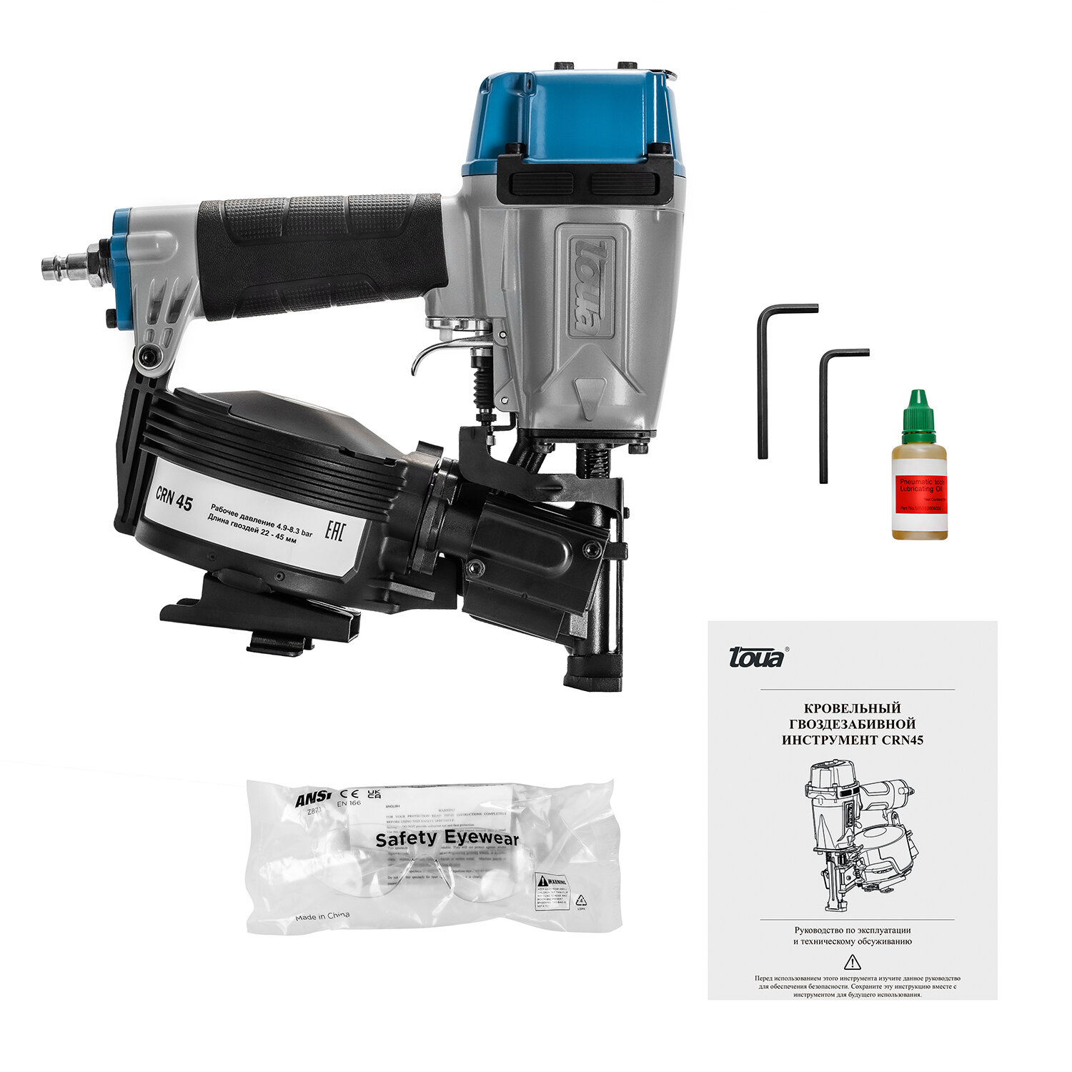 пневматический нейлер, защитные очки, масло для смазки, набор шестигранных ключей