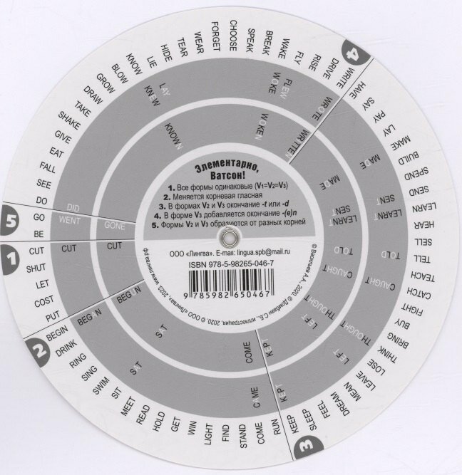 В пособии представлены наглядные таблицы, которые позволяют быстро найти соответствующие формы Past Simple и Past Participle для каждого глагола, а также его перевод. В таблице помещено 72 глагола в трех формах с переводом, а на обороте они объединены в группы со схожим способом образования.