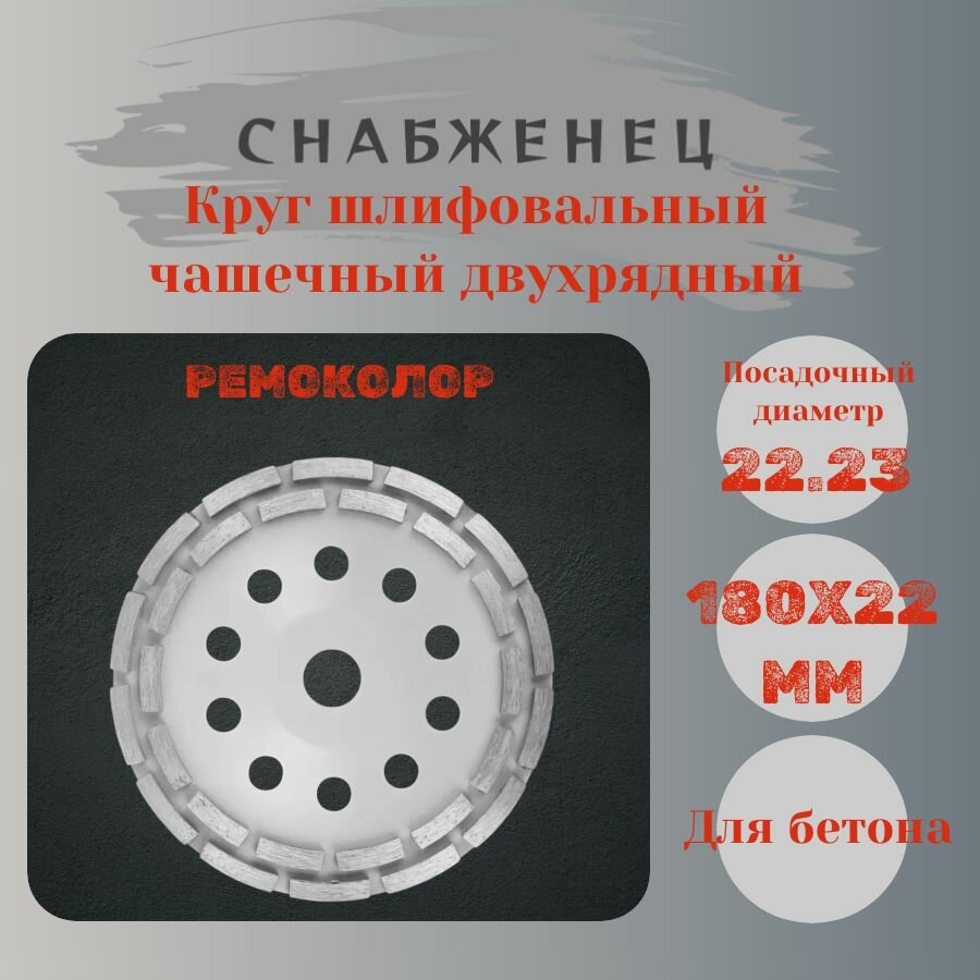 Круг шлифовальный чашечный двухрядный (180х22 мм) РемоКолор 74-0-508 предназначен для шлифовки поверхностей из камня, бетона, мрамора, гранита. Рабочий элемент для углошлифовальной или бетоношлифовальной машины. Изготовлен из термостойкой инструментальной стали. Шлифовальная кромка представляет из себя слой агломерированных синтетических алмазов на прочной клеевой основе. Рекомендуется применять на оборудовании, оснащенном системой водяного охлаждения.