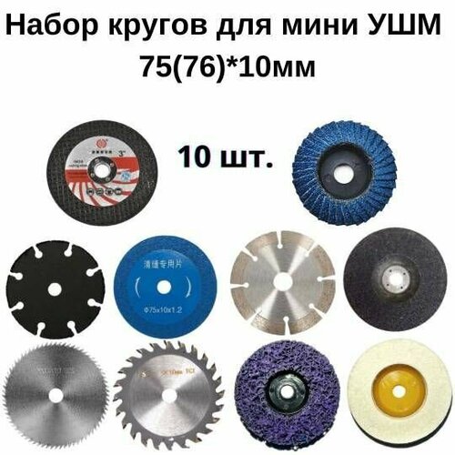 Набор кругов из 10 штук для мини болгарки УШМ 75/76мм, для разных видов работ с металлом, камнем, деревом, пластиком, стеклом и т. д.