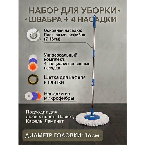 Модель комплектуется сразу 4 насадками для разных задач, поэтому Швабра круглая без ведра заменяет несколько инструментов одновременно. Это практичная Швабра круглая для пола, которая подходит для паркета, ламината, плитки, мрамора, окон и даже брусчатки. А благодаря телескопической ручке и вращающейся платформе — это действительно Умная швабра круглая, адаптирующаяся под любые условия уборки.