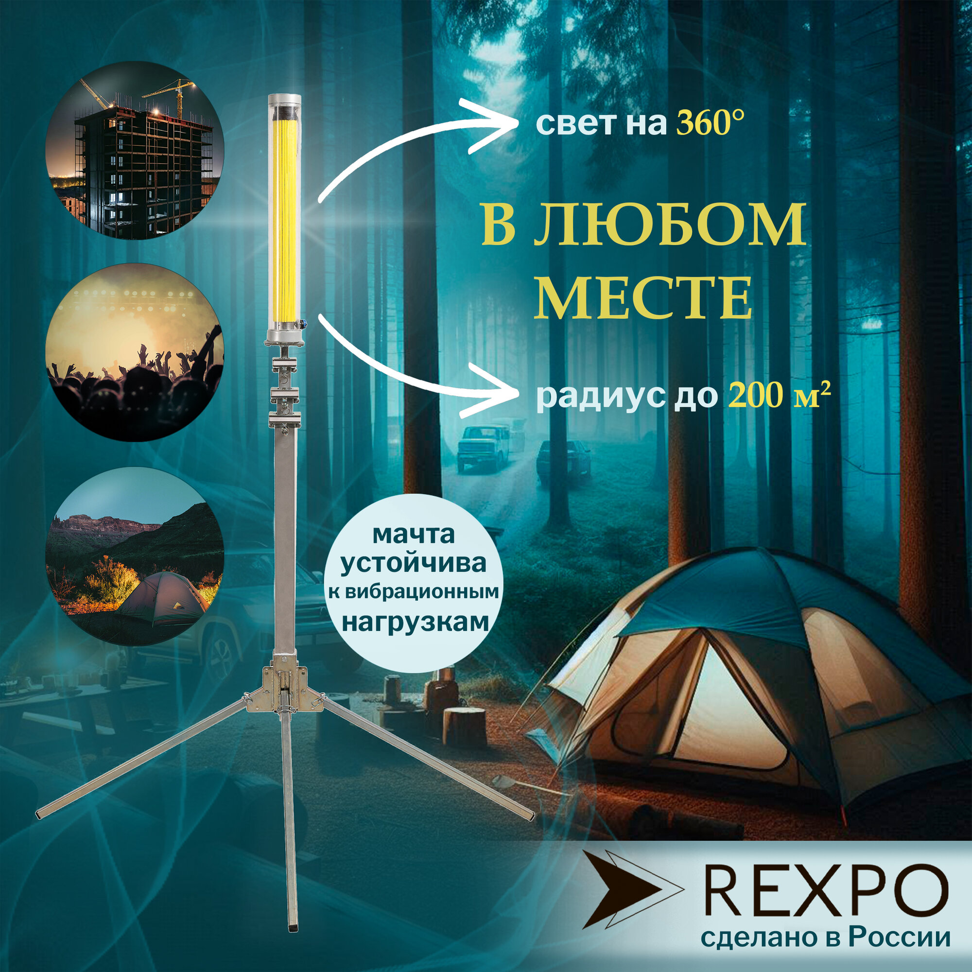 Уличный светодиодный прожектор кругового освещения REXPO-СКО-300 - это отличная альтернатива световой башне. При аналогичной светимости светодиодное решение требует гораздо меньше электроэнергии для запуска и полноценной работы. Конструкция значительно надежнее решений из нетканого материала: алюминиевой мачте не страшны порывы ветра до 25м\с, а светодиодный прожектор не нагревается до опасных температур.