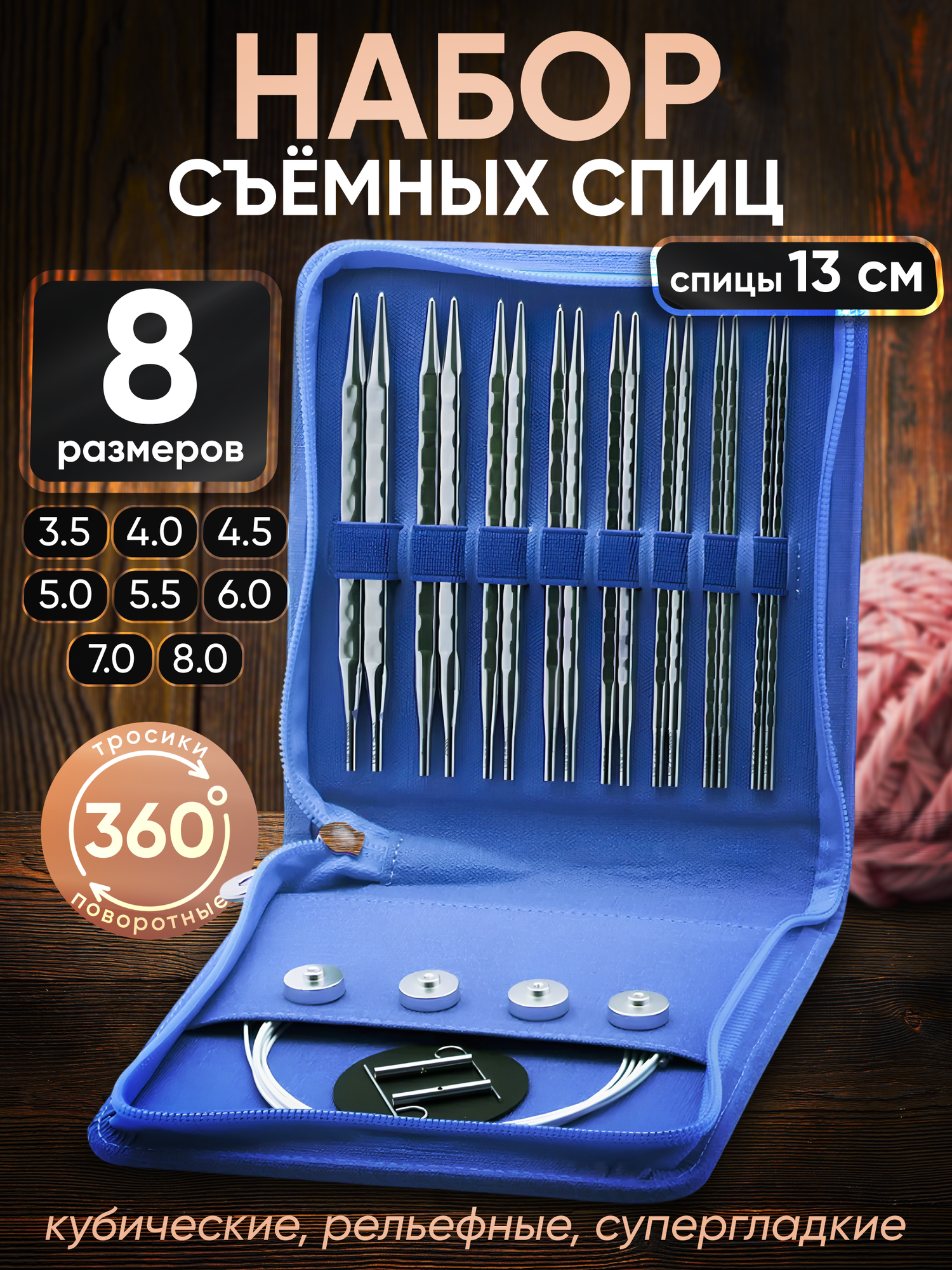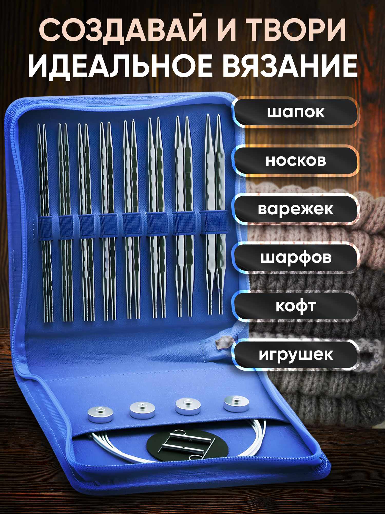 Набор круговых спиц для вязания - это идеальный выбор для рукодельниц, которые ценят качество и удобство. Этот набор включает в себя 8 спиц разного диаметра (от 3,5 до 8,0 мм), что позволяет вязать изделия из ниток различной толщины. Длина каждой спицы составляет 13 см, что обеспечивает комфортное вязание как мелких, так и крупных деталей. Спицы изготовлены из прочной нержавеющей стали, что гарантирует их долговечность и устойчивость к коррозии. Разъемная конструкция спиц позволяет легко менять длину рабочей зоны, что удобно при вязании изделий большой окружности. В комплект входят тросики, заглушки, крючки, ключ, патч и переходник для тросиков, что делает этот набор универсальным и готовым к любым вязальным задачам. Набор упакован в удобный чехол для хранения и транспортировки.