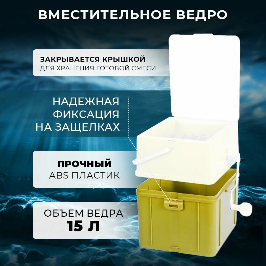 Вместительное ведро объемом 15 литров из прочного ABS-пластика с надежной фиксацией на защелках к основе круши предназначено для хранения готовой прикормочной смеси и плотно закрывается съемной крышкой.