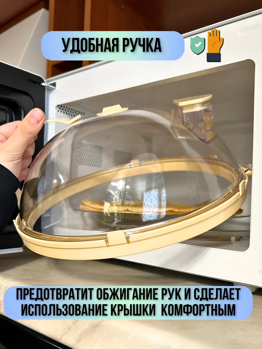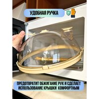 Крышка большого диаметра 26 см изготовлена из пищевого поликарбоната подходит для большинства свч. Визуально выглядит эстетично, как стеклянная с бежевым цветом в деталях. Стенки очень плотные и выдерживают температуру плавления до 200 градусов. Идеально подходит для разогрева и размораживания продуктов, хранения пищи, защиты от насекомых при еде на открытом воздухе и предотвращения распространения запахов в холодильнике.