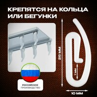 Крючки для штор, предназначенные для колец настенного карниза, изготовлены из качественного пластика. Прочный замок-щелка обеспечивает надежную фиксацию полотна, что позволяет стирать шторы и тюль, не снимая с них крючки. Эти изделия просты и удобны в использовании, их легко продеть в петлю шторной ленты. Крючки для занавесок из прочного белого пластика практически незаметны на различных расцветках штор и имеют гладкую поверхность без заусенцев. Они подходят для тяжелых штор блэкаут, плотных портьер и занавесок. Рекомендуемое расстояние между держателями для штор составляет 5-10 см. Размещение с шагом в 5 см позволяет добиться глубоких складок, в то время как крепление крючков на расстоянии 10 и более сантиметров может привести к провисанию ткани и ненадежной фиксации полотна. В итоге, для 1 метра тюля потребуется 11-15 штук, а для портьеры шириной 200 см – 25 штук.