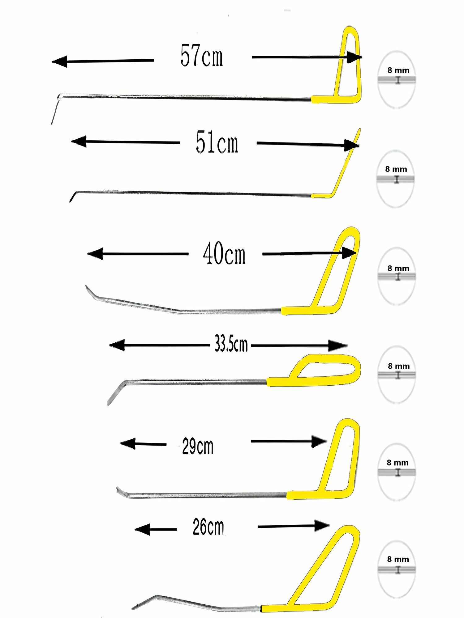 Описание: Набор включает 6 профессиональных крючков для PDR (беспокрасочного удаления вмятин), изготовленных из высокопрочной стали толщиной 8 мм. Каждый крючок имеет удобную желтую ручку для комфортной работы.
