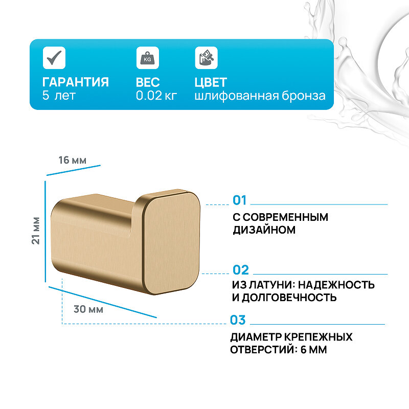 Крючок предназначен для размещения полотенец, туалетной бумаги и банных халатов. Диаметр отверстия составляет 6 мм, что позволяет использовать различные аксессуары для хранения. В комплект поставки входит крючок и крепления, что обеспечивает простоту и удобство установки. Крючок монтируется на стену с помощью шурупов.