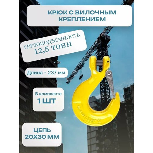 Внимание! Цвет крюка может зависеть от партии - желтый/красный. Крюк с вилочным креплением и защелкой 12,5т - это высококачественный такелажный крюк, предназначенный для использования в различных областях, где требуется надежное и прочное крепление.
