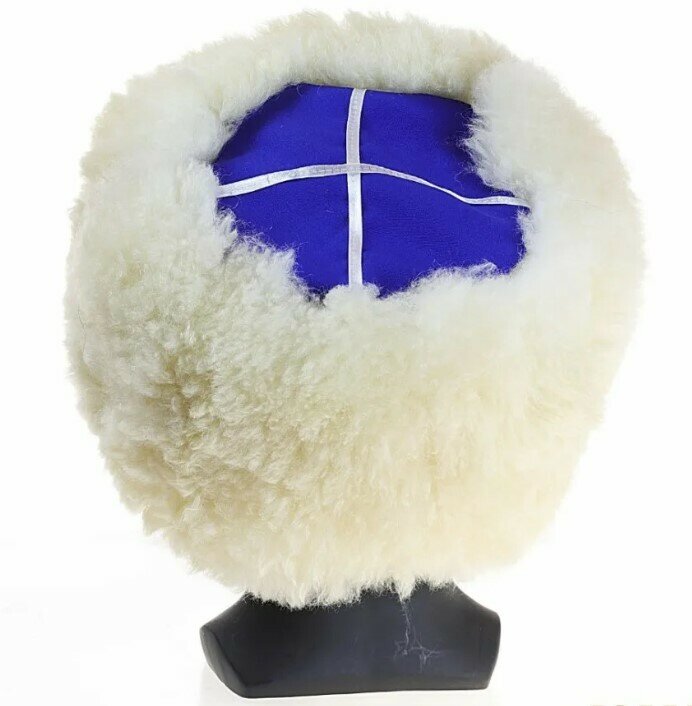 Кубанка белая с синим верхом изготовлена из натуральной овчины. Красивый и удобный головной убор, который согреет в зимнюю стужу и пригодиться как оригинальный тематический подарок