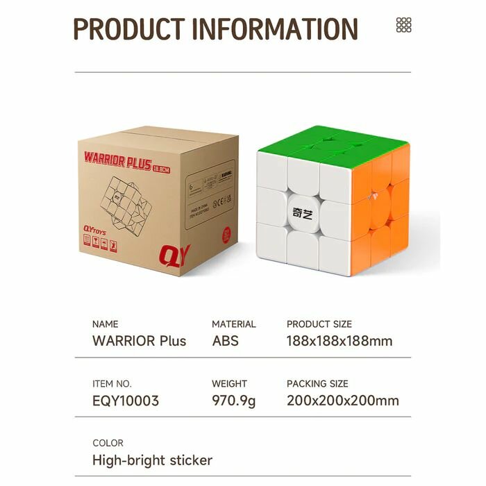 Представляем новинку января 2024 года - огромный кубик Рубика QiYi Warrior Plus! Когда-то на рынке был популярен куб размером 18 см HeShu, неплохой внешне, но имел слабоватое кручение, был уязвим к резким движениям, приезжал сразу с царапинами из-за дешёвого пластика, но был большим и дарил восторг всем, кто его видел. Увы, его время прошло. Теперь нас будет радовать превосходный куб от Чии Мофангге. Модель Warrior Plus имеет размер 18,8 см (против 18 см у HeShu), является производной от известнейшего базового кубика Рубика 3х3 для новичков - Warrior S. Как и младший брат, увеличенный вариант имеет цветной пластик, матовый и яркий. Кстати, цветовая палитра стала более классической, в отличие от привычных пастельных оттенков линейки Warrior. Кручение - потрясающее, а главное - куб даже смазан заводом! Обычно при виде подобного размера головоломок человек готов к тому, что приятного вращения ожидать не следует. Но Warrior Plus переубедит любого, он действительно феноменально вращается для своего формата). От себя добавим, что такой красивый и большой кубик Рубика подойдёт всем увлекающимся спидкубингом, коллекционерам, преподавателям, а ещё всем, кто хочет изменить внешний вид помещения, украсить его и добавить яркости. По опыту знаем, что самые разные коммерческие и медицинские заведения интересуются и уважают большой и красивый кубик Рубика.