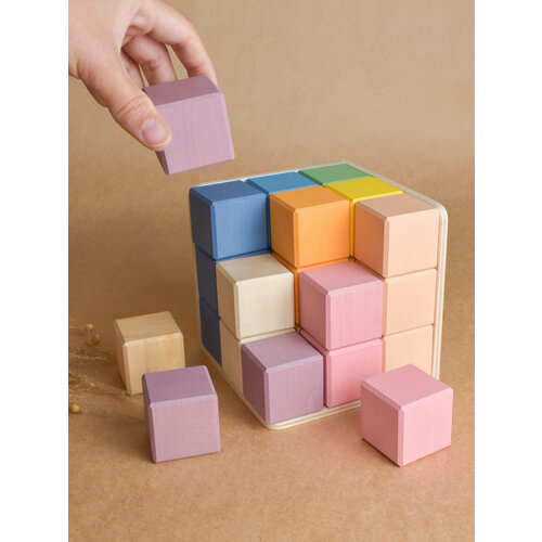 Набор деревянных кубиков в подставке — уголке в пастельных оттенках идеально подойдет для самых юных строителей. В комплект входит 27 деревянных кубиков размером 4х4 см, окрашенных в нежные пастельные цвета с использованием натурального цветного воска, который сохраняет естественную структуру дерева и применяется ведущими производителями детских игрушек. Такой воск считается одним из лучших экологичных покрытий для деревянных игрушек, он глубоко впитывается в поверхность и подчеркивает уникальный узор текстуры дерева. Эта развивающая игрушка по методике Монтессори предназначена для малышей от 1 года и способствует развитию логики, координации движений и ловкости. Деревянные кубики — это экологичная развивающая игрушка, подходящие для детей всех возрастов — от 1 до 7 лет девочек и мальчиков. Игры с тактильно приятными деревянными игрушками помогают развивать мелкую моторику и речь у малышей. Пастельные цвета набора порадуют бежевых мам. Этот крупный деревянный конструктор станет отличным подарком для малыша или малышки на рождение, день рождения или Новый год. Все кубики изготовлены вручную из массива дерева, каждая грань тщательно отшлифована и имеет фаску для безопасности ребенка. Размер кубиков подходит для маленьких ручек, а тактильное ощущение натурального дерева способствует развитию моторики и речи, а также подготовке к школе. Пастельная палитра не нагружает зрение и делает игру приятной и спокойной. Деревянные кубики для малышей отлично подходят для занятий с нейропсихологом. Во время игры ребенок ощущает тепло натурального материала, его фактуру и вес. Каждая игрушка уникальна благодаря ручной работе. Набор деревянных детских развивающих больших кубиков для малышей станет не только развивающей игрушкой, но и красивым элементом декора любой детской комнаты.