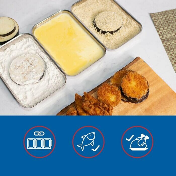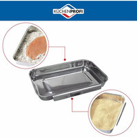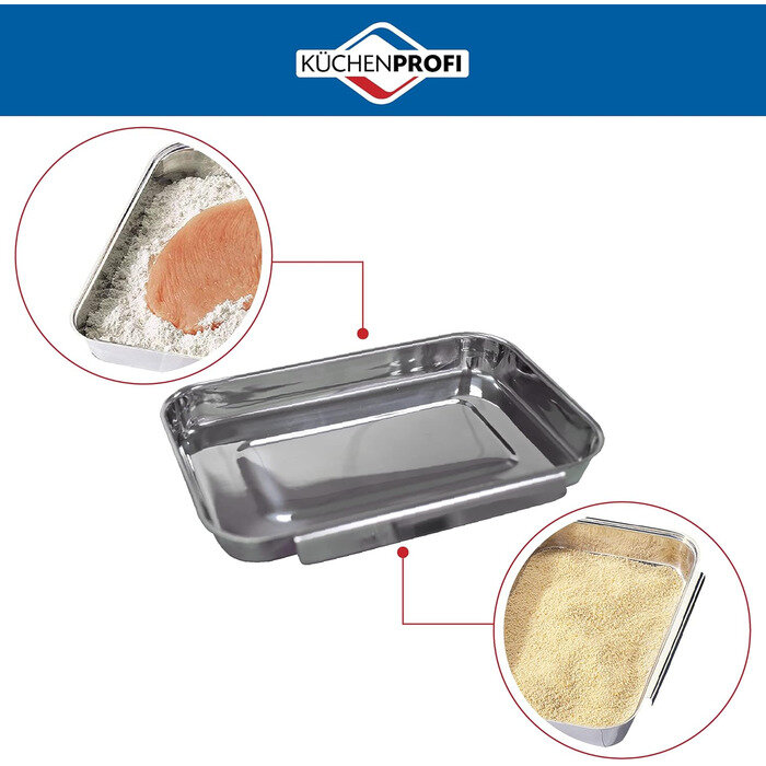 Продукт Очень практичный помощник на кухне для панировки, порционирования и маринования. Лучшая нержавеющая сталь 18/10, абсолютно гигиенична и проста в уходе. Размеры: (Д х Ш х В) 22 х 15х 3 см Поставляется в красивой подарочной коробке. 5-летняя гарантия производителя с даты покупки компанией KÜCHENPROFI (KÜCHENPROFI GmbH, Höhscheider Weg 29, 42699 Solingen) при условии в Германии при предъявлении документа, подтверждающего покупку. Другие законные права не ограничены. Рис: Украшение не входит в комплект поставки!