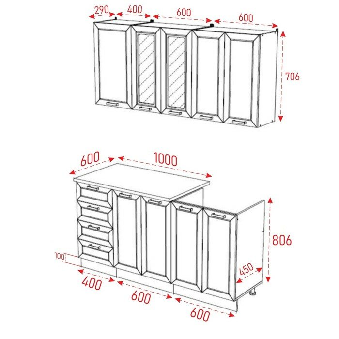 настенный шкаф с одной дверцей, настенный шкаф со стеклянными вставками, настенный шкаф с двумя дверцами, шкаф напольный с ящиками и дверцами, шкаф напольный под мойку