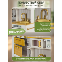 • Детская игровая кухня для девочки включает в себя варочную панель, раковину, духовой шкаф, свч-печь и полки для хранения. Все дверцы открываются и закрываются.