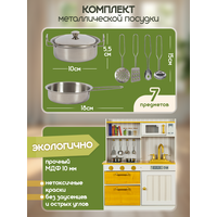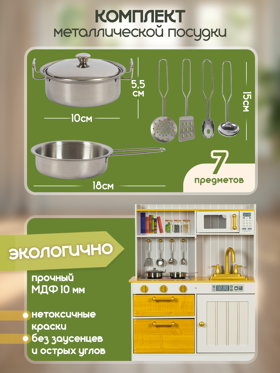 • В комплект входит набор игрушечной посуды детской: металлические лопатка, половник, ложка для спагетти, шумовка, кастрюля с крышкой и сковородка легко моются и устойчивы к царапинам.