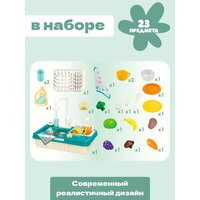 • Настоящий поток воды из раковины, обеспечиваемый встроенным моторчиком, учит ребёнка аккуратно мыть предметы, стимулируя развитие привычки к чистоте.