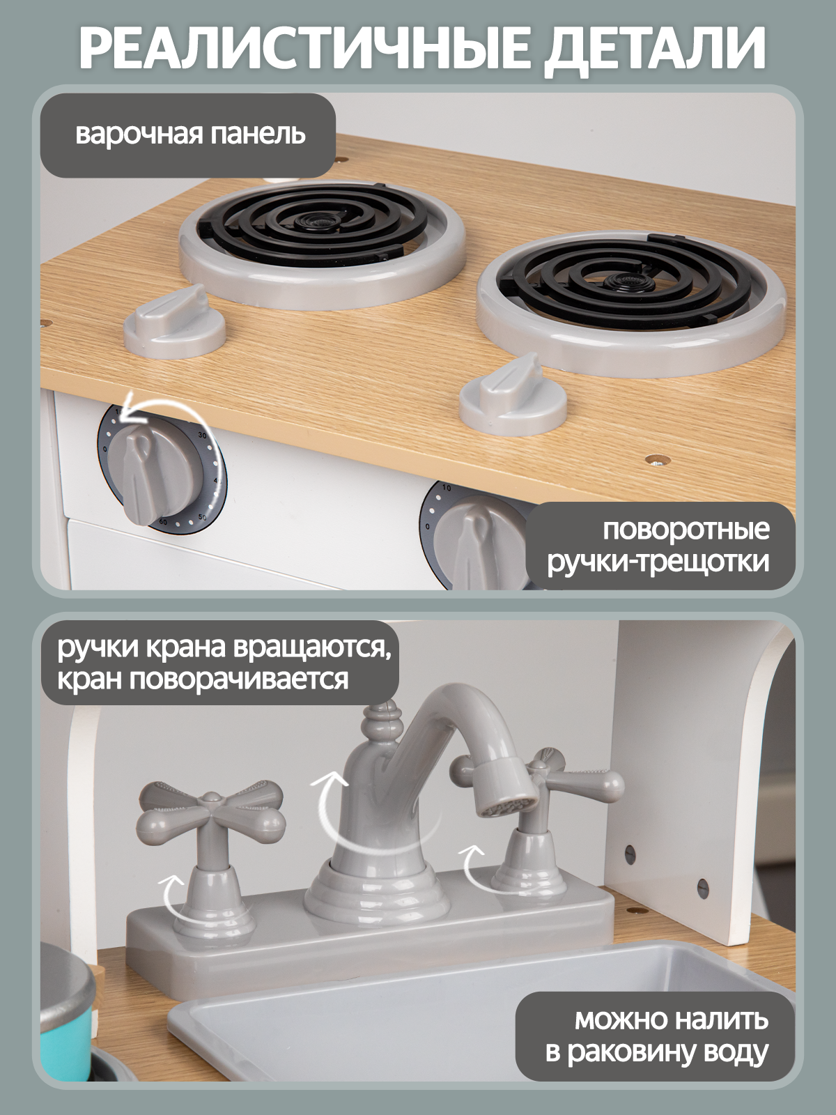 • На варочной панели — две конфорки (диаметром 12 см), каждая с декоративной спиралью, имитирующей нагрев, и четыре ручки-трещотки, которые щёлкают при поворотах — помогают развивать мелкую моторику и создают ощущение настоящей плиты.