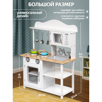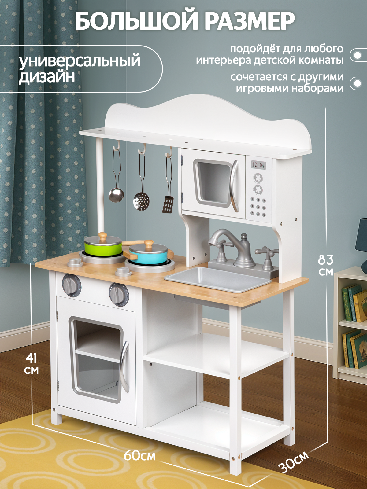Детская кухня деревянная 7-в-1 с посудой — большая игрушка для девочки и для мальчика, которые любят придумывать истории, повторять за взрослыми и осваивать «взрослые» роли. Кухня детская игровая деревянная легко вписывается в интерьер детской комнаты и становится центром сюжетных игр.
