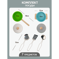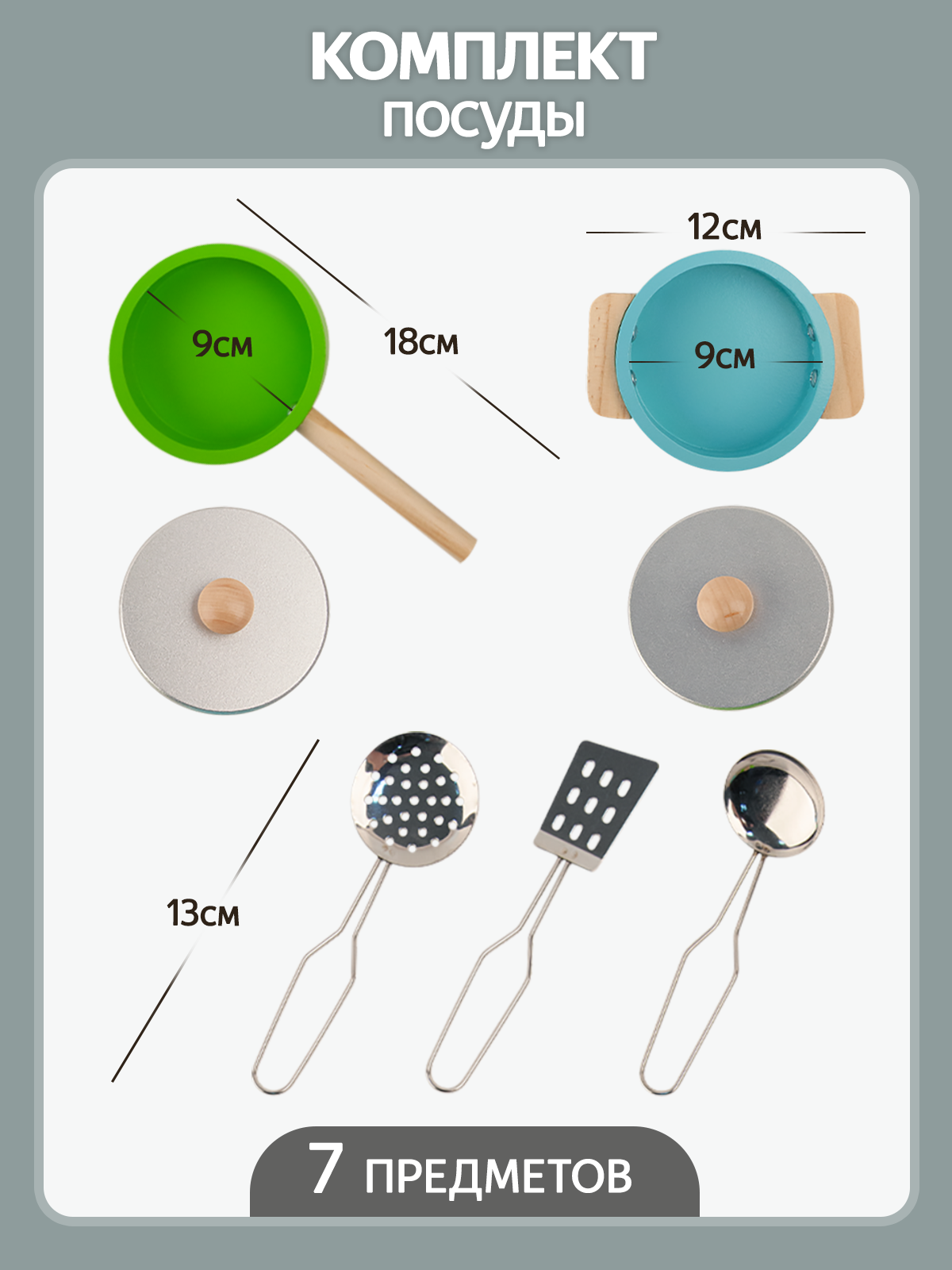 • Деревянные кастрюля и сковородка с крышками — миниатюрные аналоги взрослой посуды, идеальный набор детской посуды для ролевой игры.