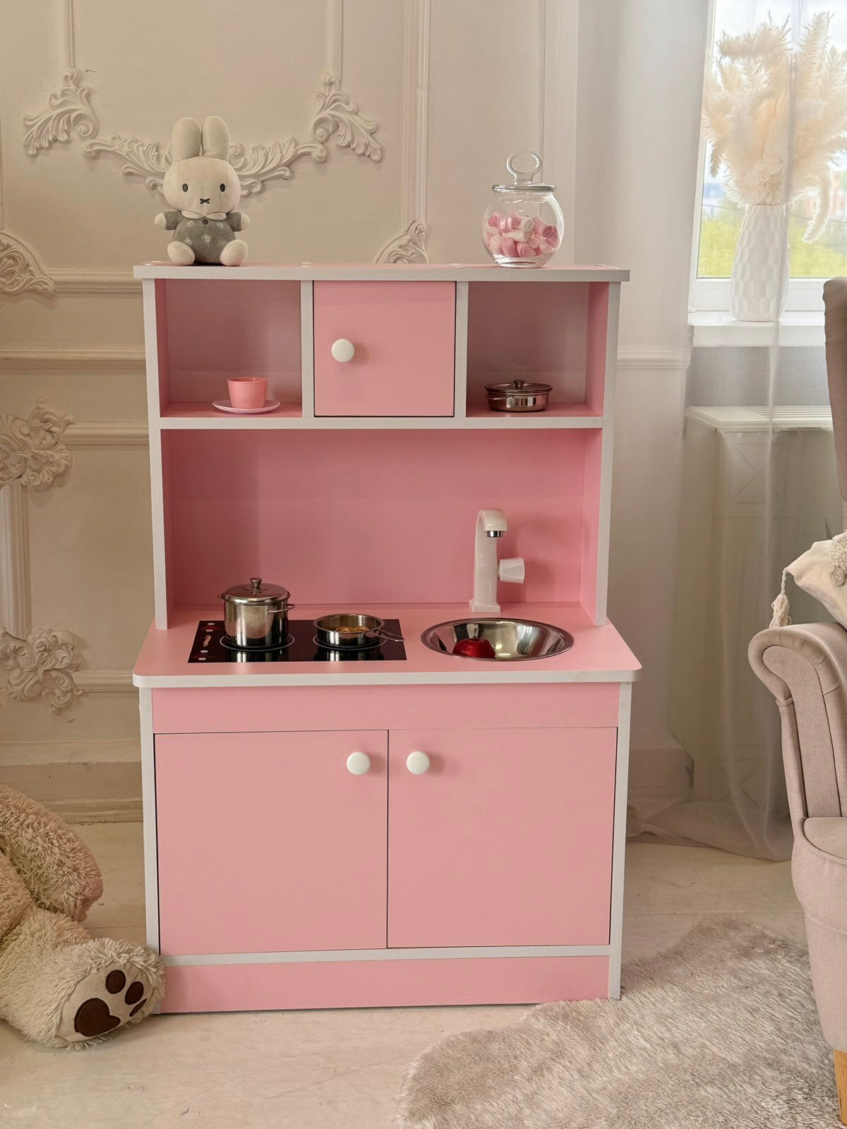 С помощью этой кухни ваш ребенок сможет моделировать различные жизненные ситуации, познавать заботу и хозяйственность, а также примерить на себя различные социальные роли. Это способствует развитию мышления и фантазии, а также налаживанию взаимоотношений с другими детьми.