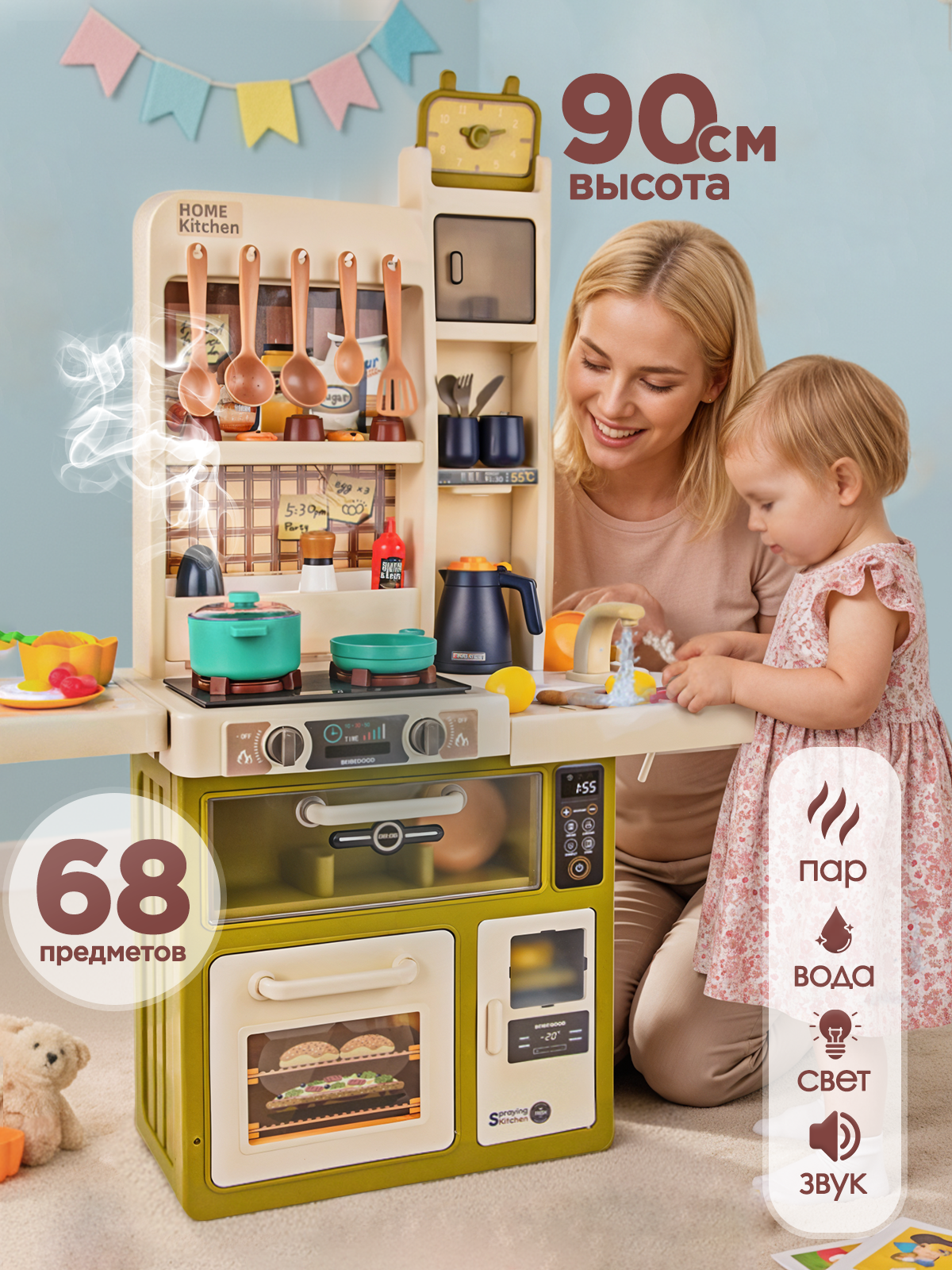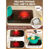 Кухня детская игровая с холодным паром, светом и звуком — это интерактивный игровой набор для девочек, который превратит игру в настоящую кулинарную студию! Интерактивная игрушечная кухня оснащена плитой с эффектом холодного пара, варочной панелью со светом и звуком, духовкой, холодильником, раковиной с возможностью использования настоящей воды, полками и шкафчиком для хранения.