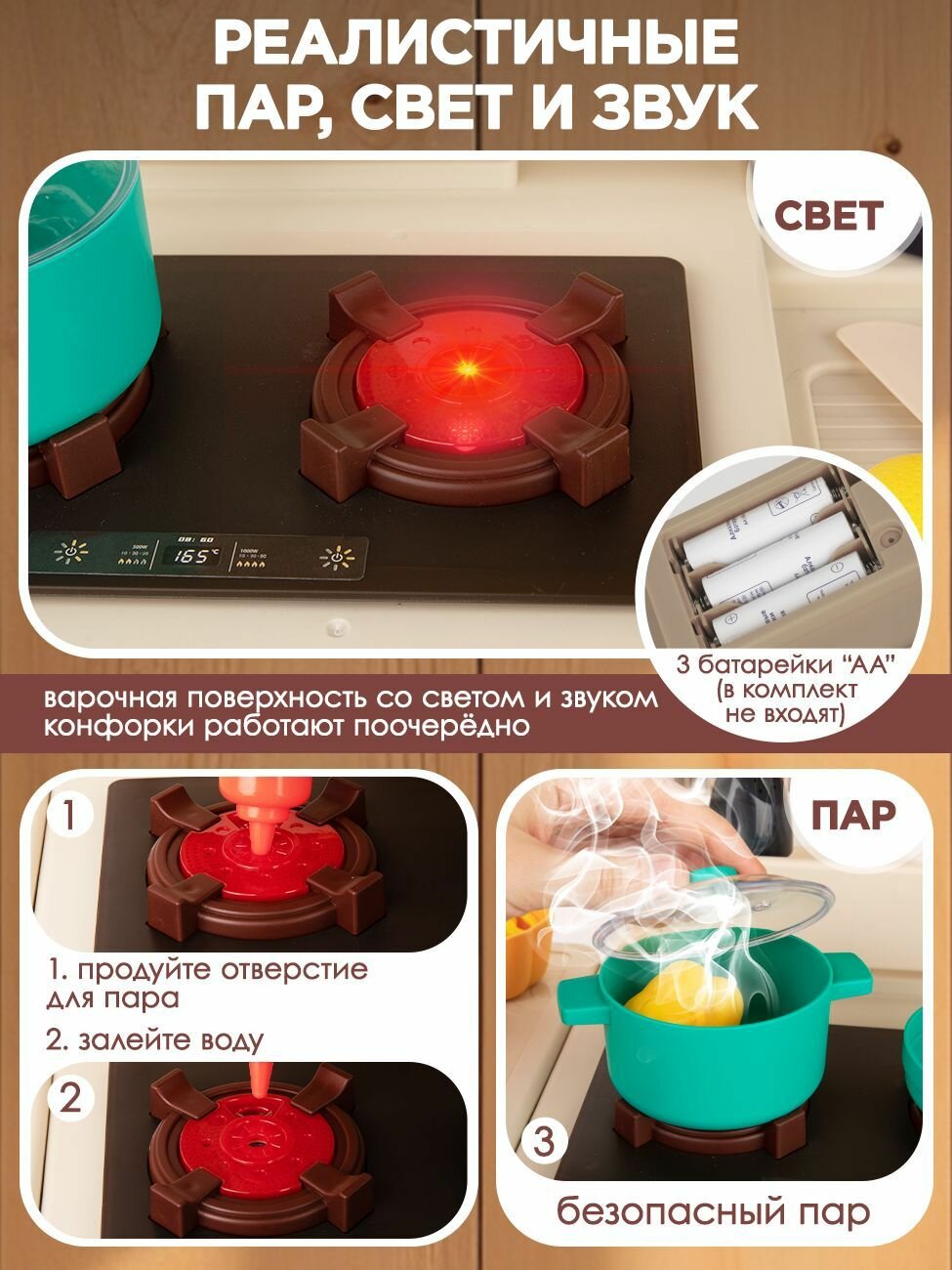 - Холодный пар и световые эффекты: Левая конфорка оснащена емкостью для воды, добавьте 40 мл воды и получите эффект холодного пара. При первом использовании нужно продуть воздушную пробку в конфорке. Обе конфорки оснащены звуками жарки и кипения, а при их работе включается подсветка, имитирующая горение.