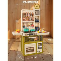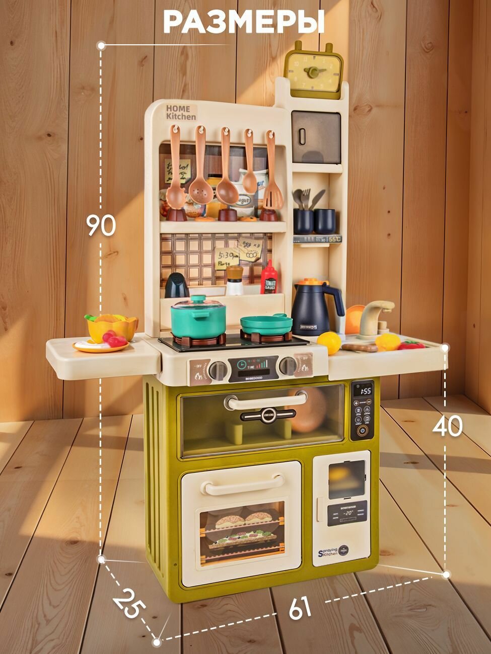 Размеры: 90х61х25 см, высота до варочной поверхности — 40 см. Для работы игрушечной кухни потребуются 3 батарейки типа AA (в комплект не входят).