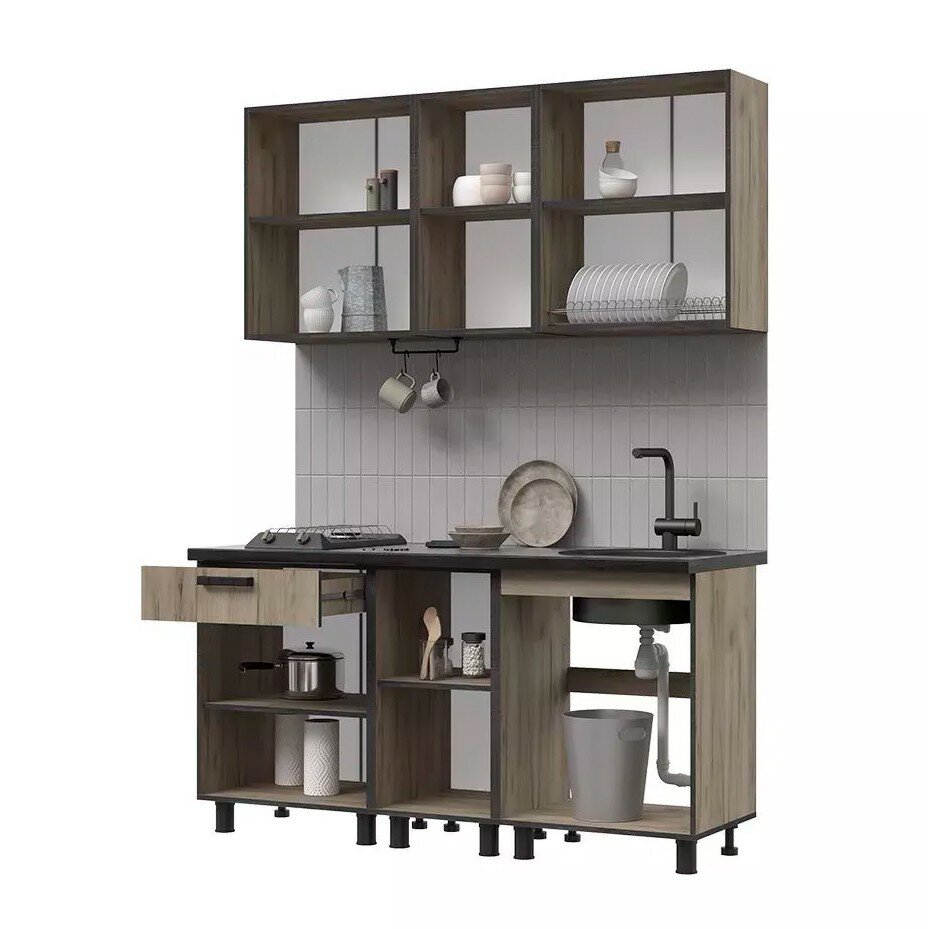 Кухня Эдинбург 1.6 выполнена в стиле лофт, сочетающем в себе практичность и эстетику. Темно-коричневый цвет корпуса и фасада из ЛДСП (ламинированной древесно-стружечной плиты) придает изделию солидность и устойчивость к износу.