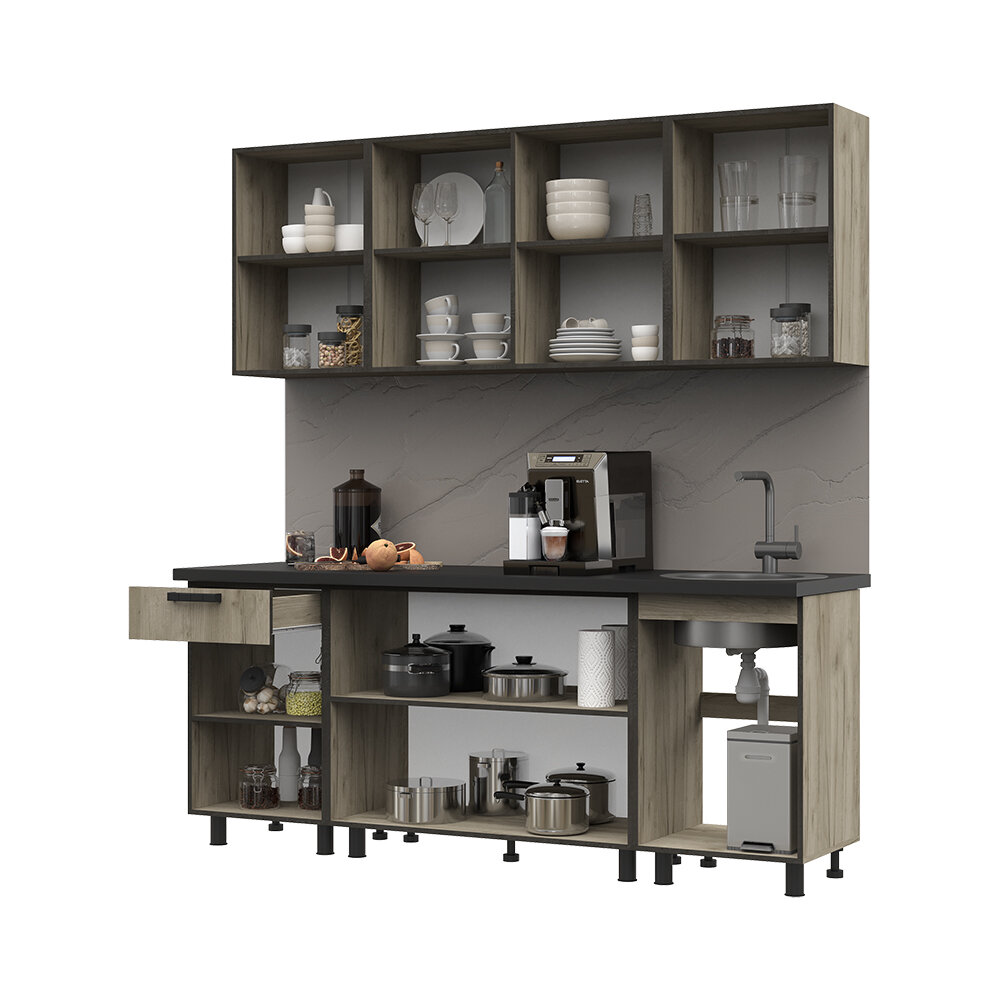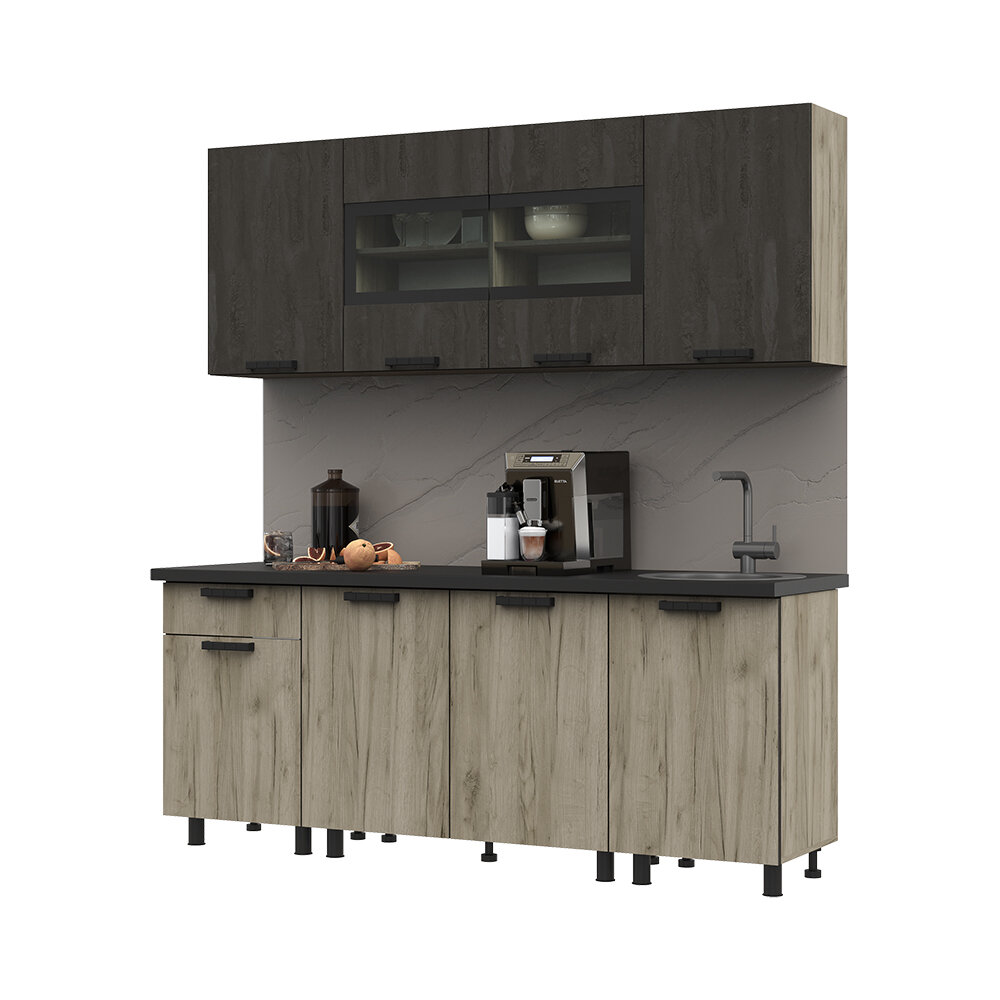 Интегрированные стекла центрального модуля открывают красоту состаренного дуба в декоре корпуса. Важным акцентом являются черные элементы в виде регулируемых опор, массивных ручек, и, конечно же, мощной цельной столешницы толщиной 38 мм.