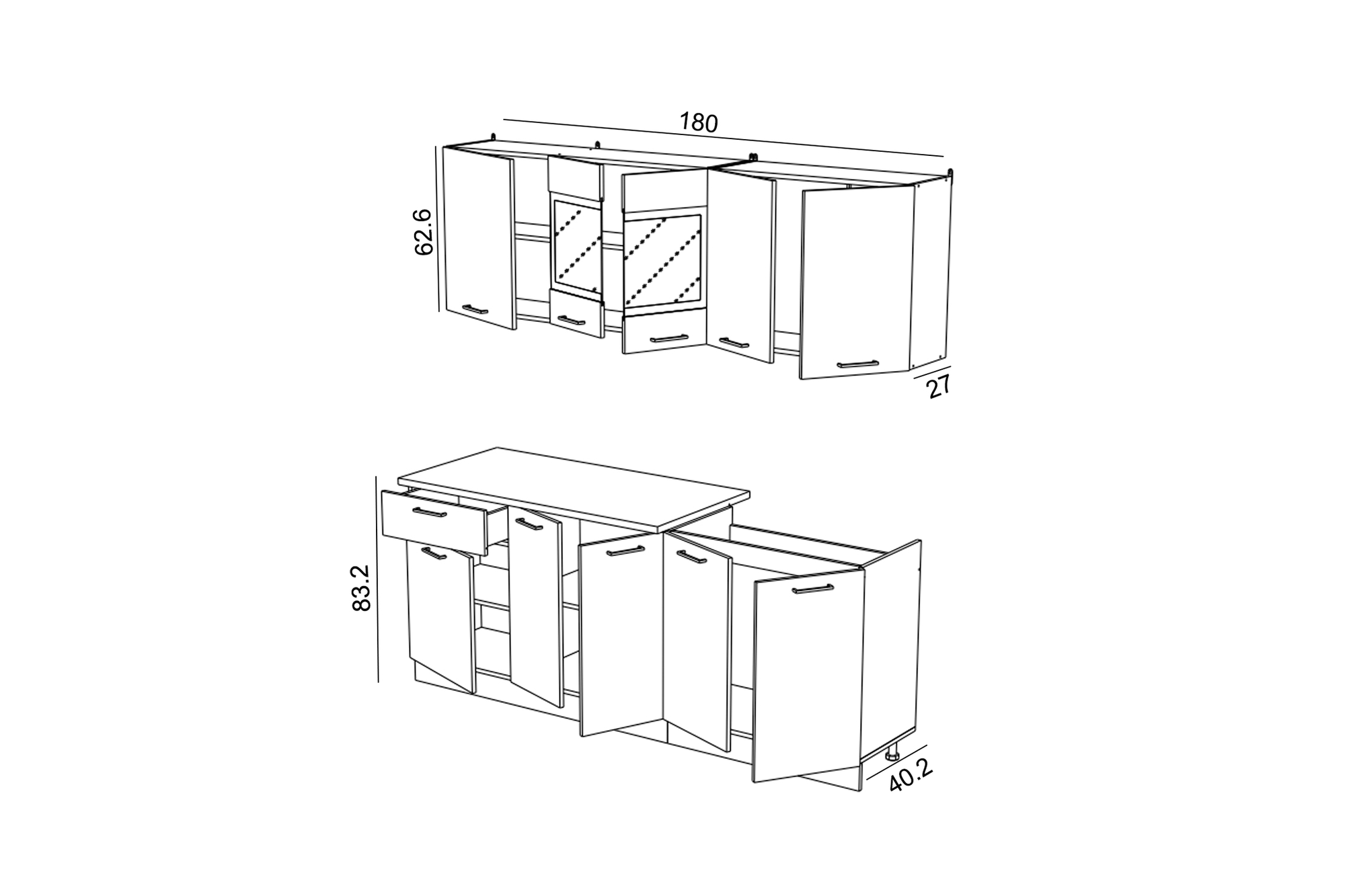 Глубина верхних шкафов: 29 см; Глубина нижних шкафов: 42 см; Высота верхних шкафов: 62.6 см; Высота нижних шкафов: 83.1 см; Глубина корпуса под столешницей: 42 см; Глубина по столешнице: 60 см; Глубина верхних и нижних шкафов указана с учетом фасада. Высота нижних шкафов указана с учетом столешницы.
