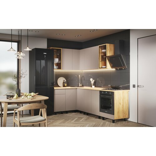 ✨Кухня Эталон 1,4*2,4 угловая холст латте/дуб крафт МДФ – это современное и стильное решение для вашей кухни. Угловая конструкция позволяет максимально эффективно использовать пространство, а фрезеровка волна придает гарнитуру особый шарм.