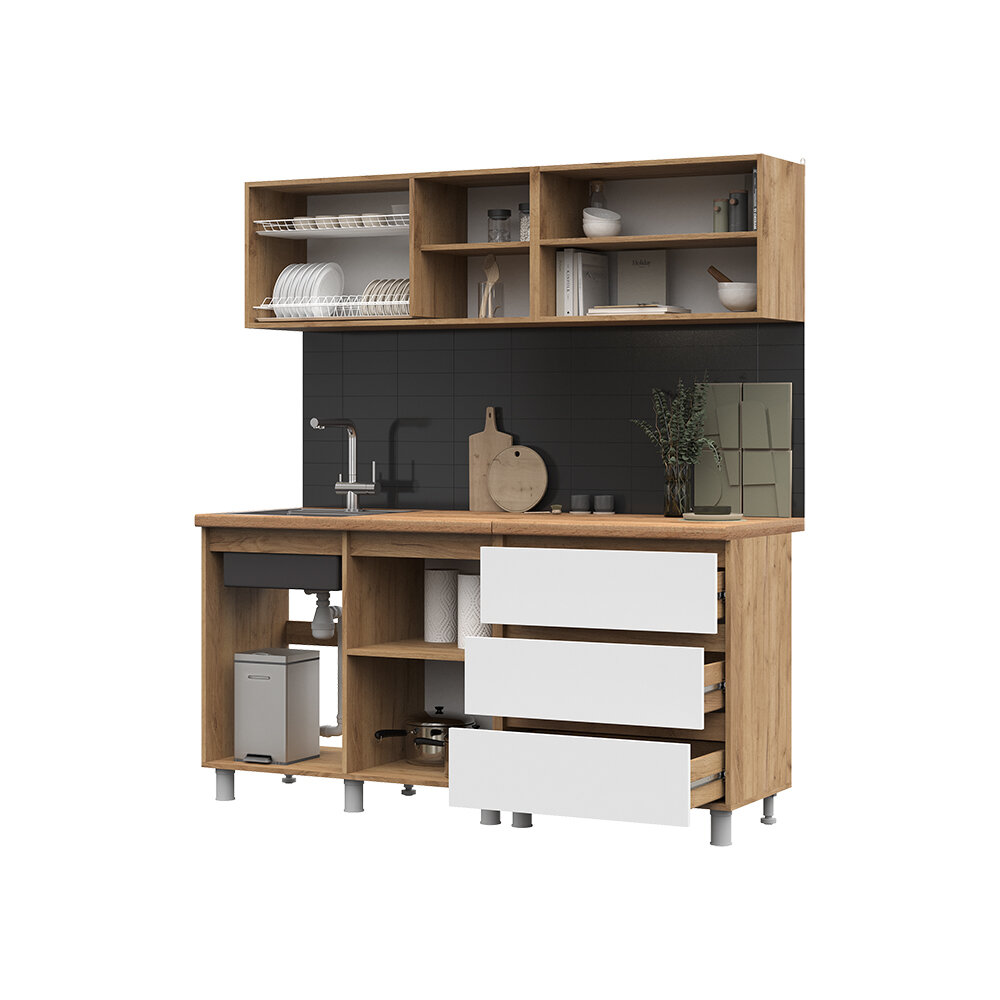 Верхние модули представляют собой комбинацию из открытых и закрытых полок. Модуль шириной 1000 мм открывается с помощью газлифтов захватом снизу и разделен на две секции: широкую - под сушку для посуды и небольшую секцию с полкой. Второй верхний открытый модуль шириной 700 мм разработан с делением на две полки под хранение посуды, необходимых специй, элементы декора. Нижняя полка открытого модуля имеет декоративную горизонтальную планку.