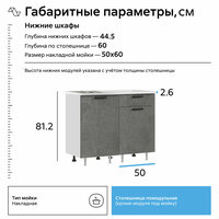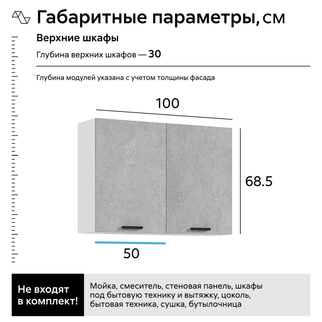 Цоколь в комплект не входит. Глубина верхних и нижних шкафов указана без учета фасада. Высота нижних шкафов указана с учетом столешницы.