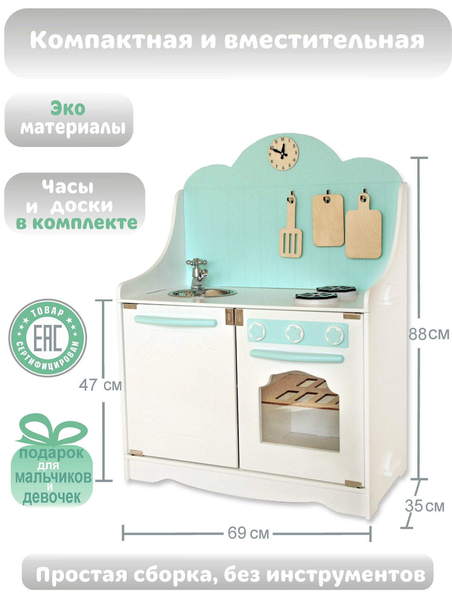 Идеальна для девочек и мальчиков, которые любят помочь маме с готовкой! Теперь у малыша будет своя стильная интересная зона для приготовления еды. Ребенок придумает сюжетно-ролевые игру с участием чашек тарелок и различных маминых рецептов при этом развивая творческие способности, социальные навыки и моторику. Это поможет приучить к порядку, и заботите о близких. Размер в собранном виде: Ширина-69см. Глубина-35см. Высота столешницы -47см. У нее есть круглая мойка, удобный игрушечный кран без воды, ручки для конфорок, открывается фасад духовки и шкафчика. Часики имеют циферблат и стрелочки. В комплект идут три предмета кухонных деревянных досок. Изделие изготовлено из высококачественного МДФ и березовой фанеры высшего качества толщиной 6-8-10 мм. Уникальная система сборки, без инструментов, как конструктор. Приобретая наш продукт, вы увидите не только качественное и сертифицированное изделие, а также восторг, радость и яркие эмоции вашего ребенка. Произведено в России из качественных материалов с любовью и заботой. Приятных покупок.