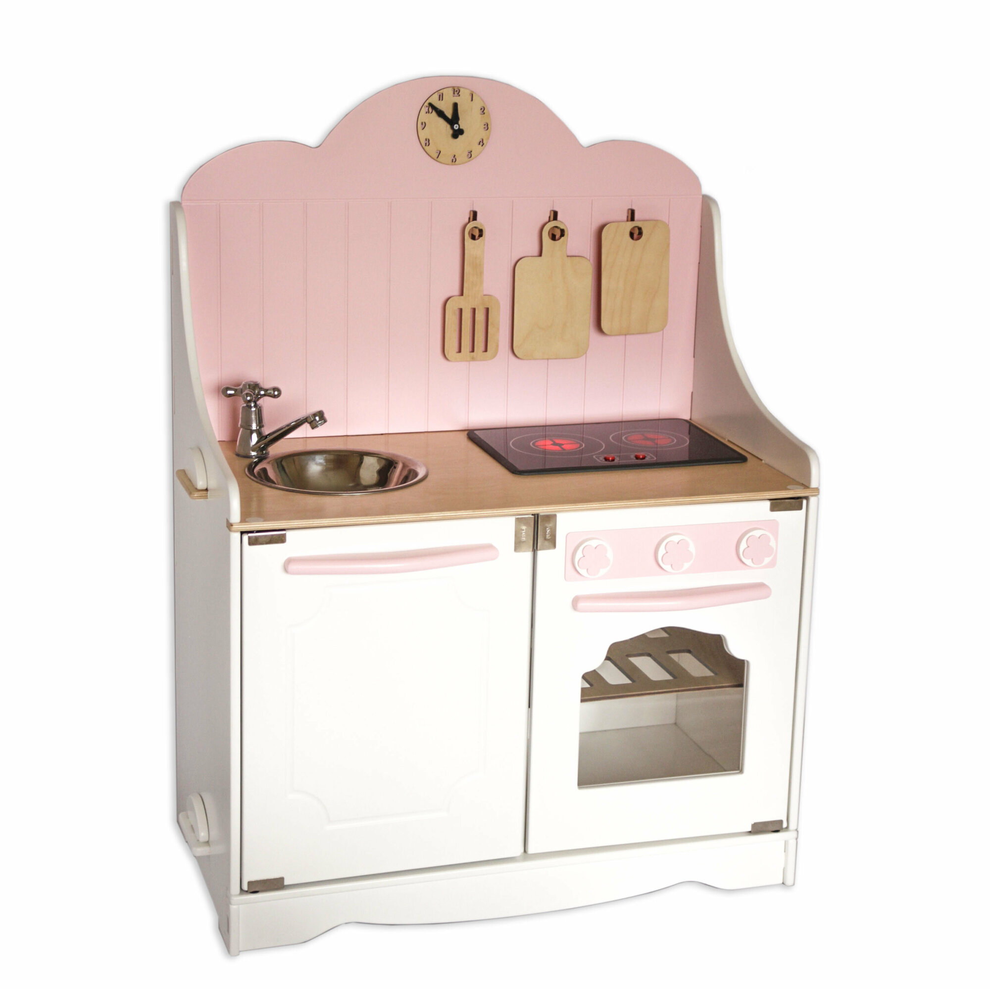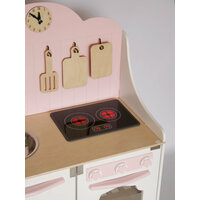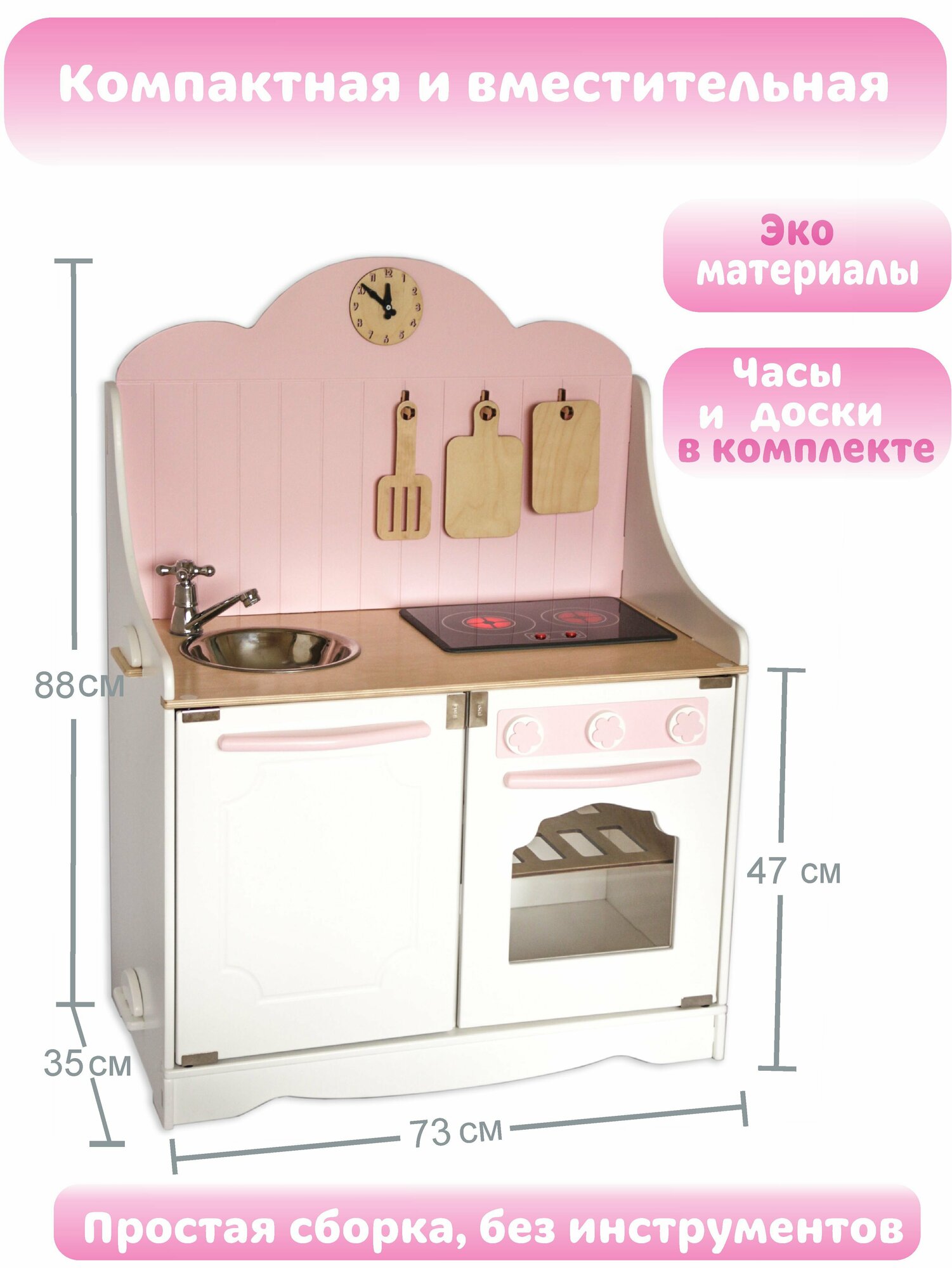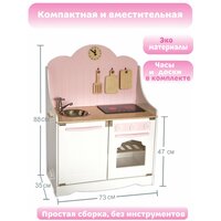 Игровая кухня для девочек в любимом розовом цвете! Плита у этой модели светится и имеет звуковые сигналы: жарит и варит. Теперь у малышки будет своя стильная интересная зона для приготовления еды. Ребенок придумает сюжетно-ролевые игру с участием любимых игрушек, чашек, тарелок и различных маминых рецептов при этом развиваются творческие способности, социальные навыки и моторика. Такая игра поможет маленькому поваренку приучить к порядку, и заботите о близких, приготовит для любимой мамы и папы, бабушки и дедушки, принцесс и кукол все возможные блюда и десерты. Размер в собранном виде: Ширина-69см. Глубина-35см. Высота столешницы -47см. У нее есть круглая мойка, удобный игрушечный кран крутится (без воды), ручки конфорок крутятся, открывается фасад духовки и шкафчика. Часики имеют циферблат и стрелочки. В комплект идут три предмета кухонных деревянных досок. Аксессуары входящие в кухню: плита (свет и звук), часы, 2 досочки и лопатка, выполнены из натурального древа и покрыты акриловым лаком. Изделие изготовлено из высококачественного МДФ и березовой фанеры высшего качества толщиной 6-8-10 мм. Уникальная система сборки, без инструментов, как конструктор. Приобретая наш продукт, вы увидите не только качественное и сертифицированное изделие, а также восторг, радость и яркие эмоции вашего ребенка. Подходит на подарок детям от 1 года, 2 годика, 3 года до 4 ,5 лет. Произведено в России из качественных материалов с любовью и заботой. Приятных покупок.