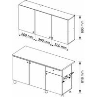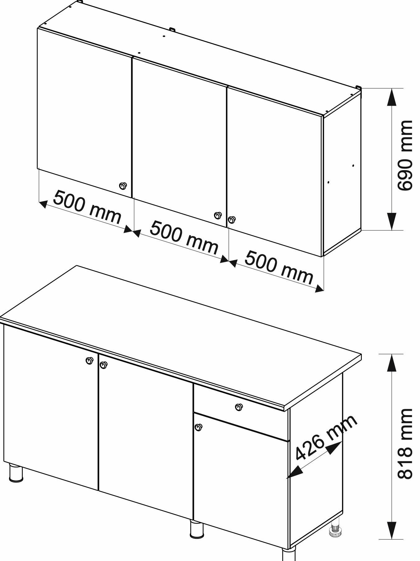 В гарнитур также входит верхний шкаф общей шириной 1500 мм, разделен на три отделения 50 см.