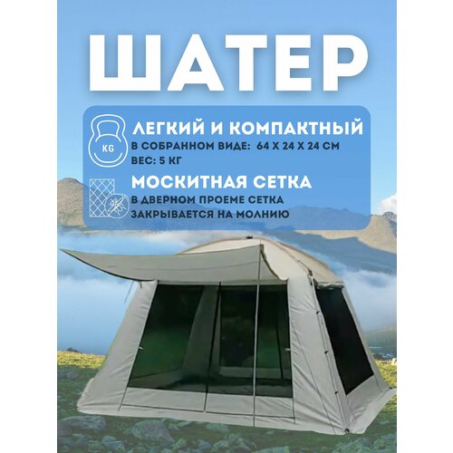 Туристическая палатка-кухня имеет классическую форму, четырехскатную коническую крышу и весьма приличную высоту - 245 см, так что даже самым высоким людям не придется нагибаться внутри палатки. Боковые стенки имеют анти-москитные сетки, которые отлично защищают от насекомых и отлично пропускают солнечный свет. При наступлении ночи боковые стенки закрываются раскатными шторками. Характеристики: Общий размер 380х380х245 см. В собранном виде помещается в маленькую сумку-переноску. Высота палатки 245 см - выше роста человека, можно подвесить люстру. Противомоскитная сетка не позволяет насекомым проникнуть внутрь палатки. Водонепроницаемый тент: 210D водонепроницаемый Оксфорд 3500 мм. Пол:210D PU водонепроницаемый Оксфорд 3500 мм. Каркас: f16 оцинкованные стальные столбы и стекловолокно х11 мм.