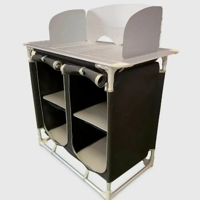 Конструкция для палаток Berger создаст непревзойдённый комфорт не только в длительных путешествиях или в базовом лагере, но и может послужить на даче. Максимально простая установка. Туристическая кухня предлагает достаточно места для хранения посуды и продуктов, благодаря 4 отсекам для хранения. Их можно открыть с помощью встроенной молнии, что означает, что они также могут быть использованы для крупных предметов. Подвижная панель и устойчивая рама изготовлены из легкого алюминия. Ножки регулируются по высоте и могут компенсировать неровности пола. Характеристики: