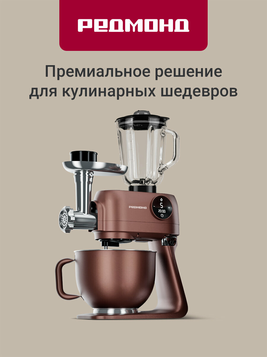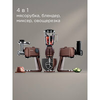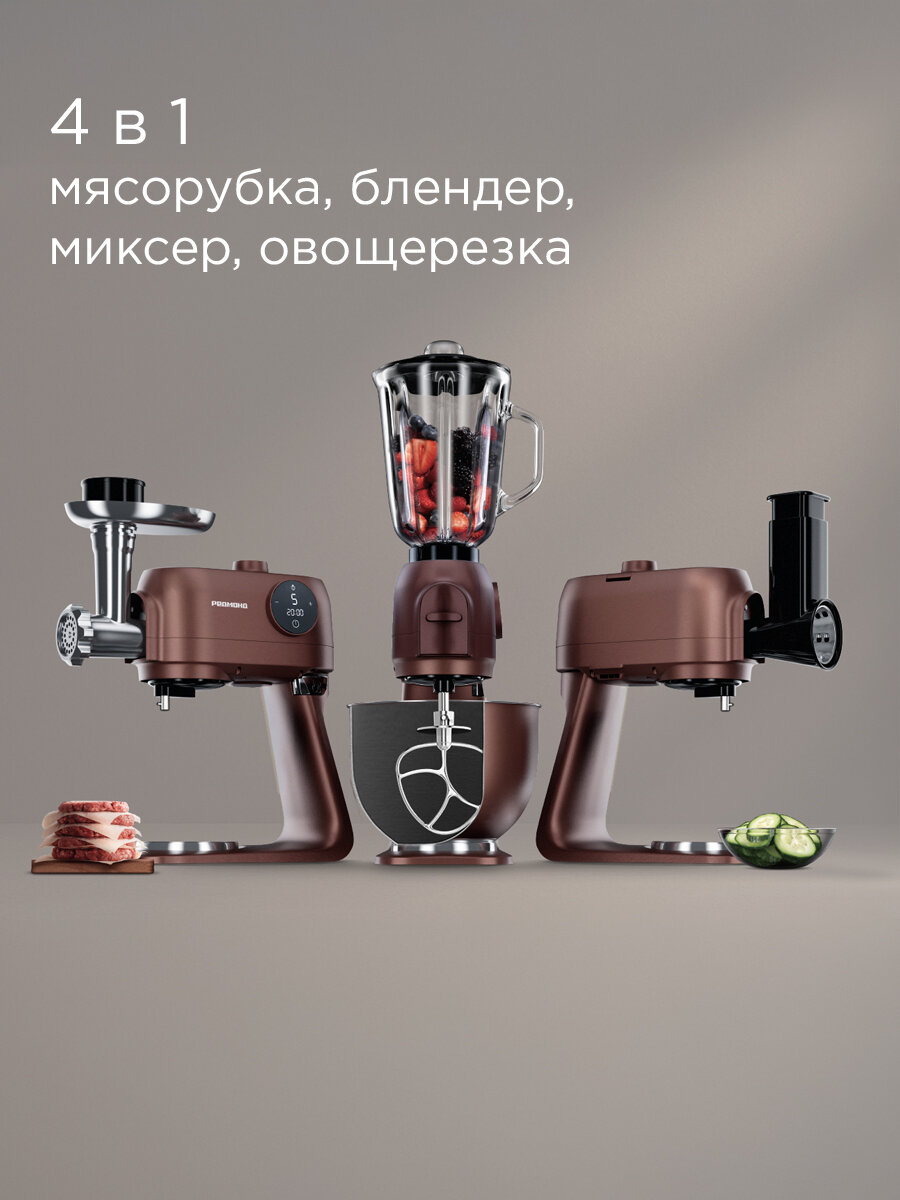 | Насадки | венчик для взбивания, для замешивания теста, для кеббе, для колбасок, для нарезки ломтиками, для нарезки соломкой, мясорубка, насадка-терка |