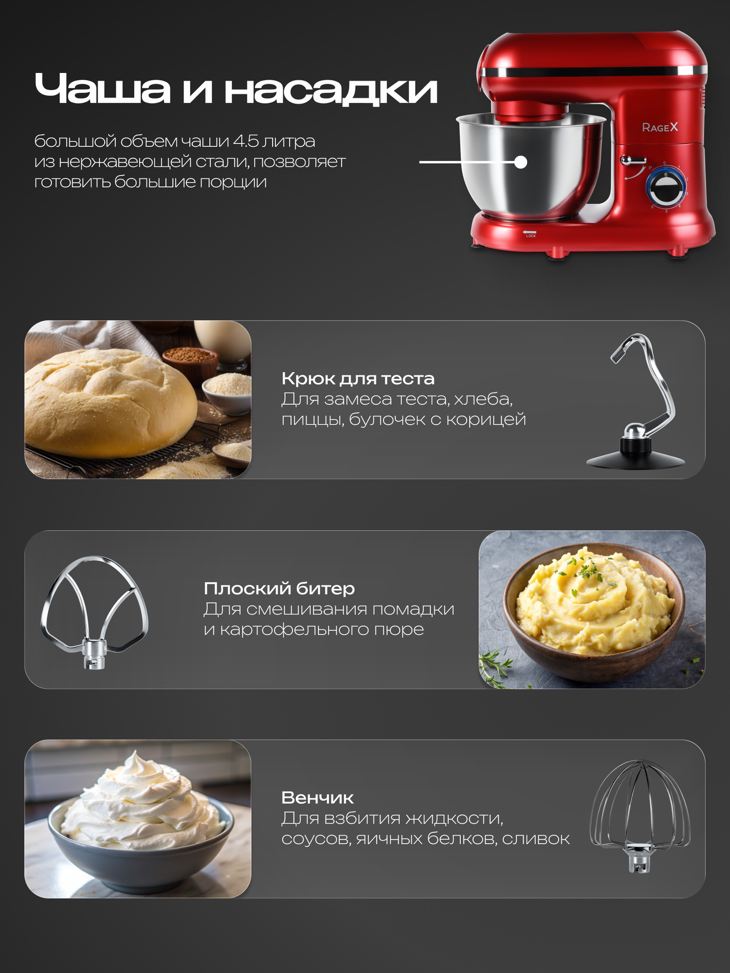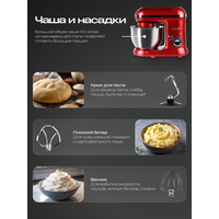 - Планетарный миксер с чашей объемом 4.5 л из нержавеющей стали;