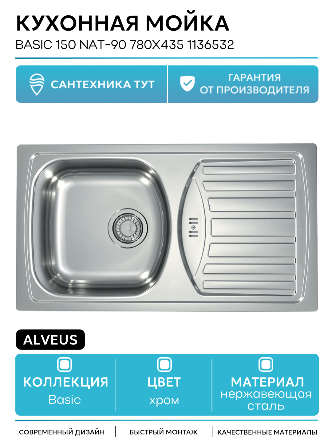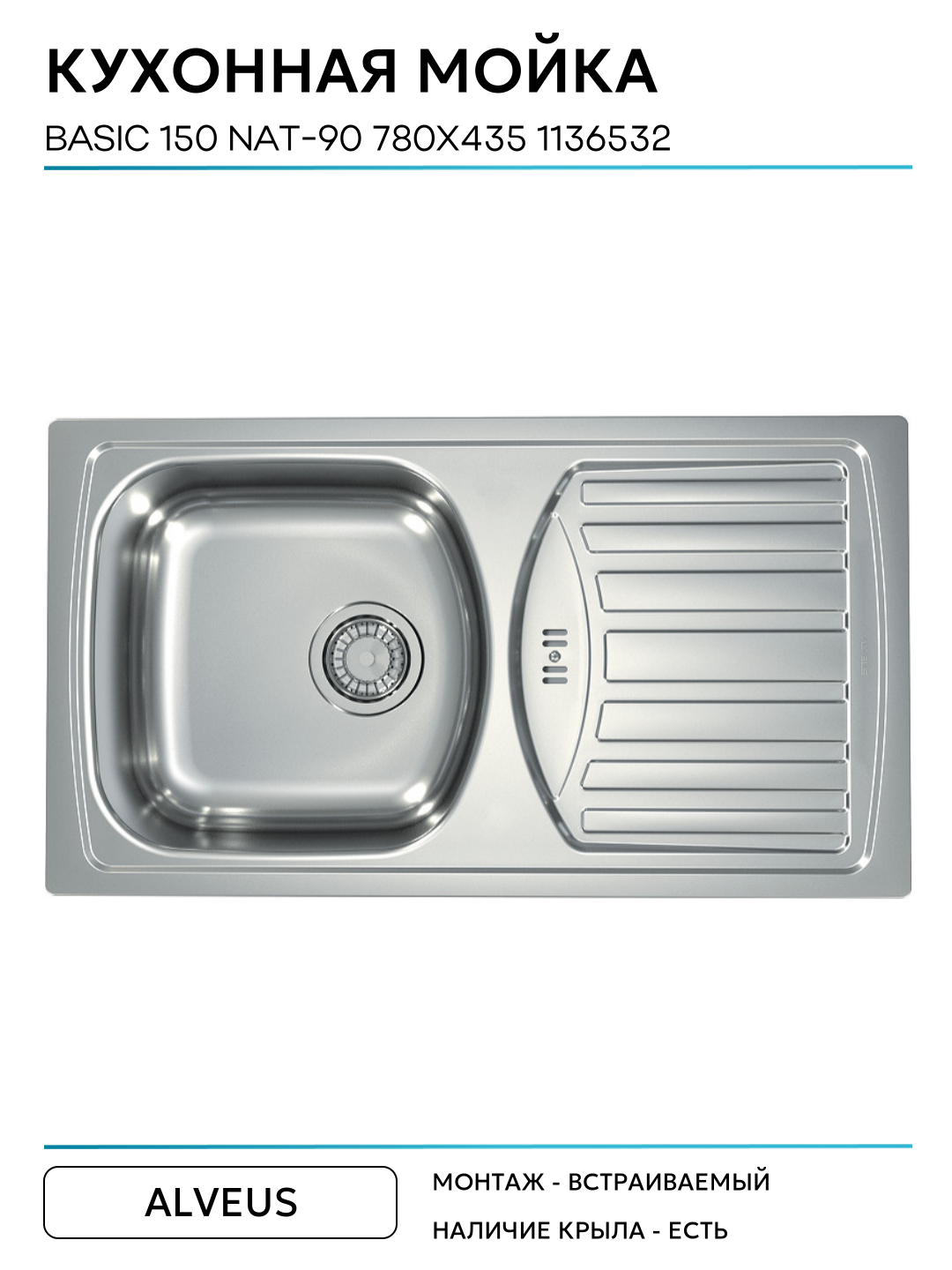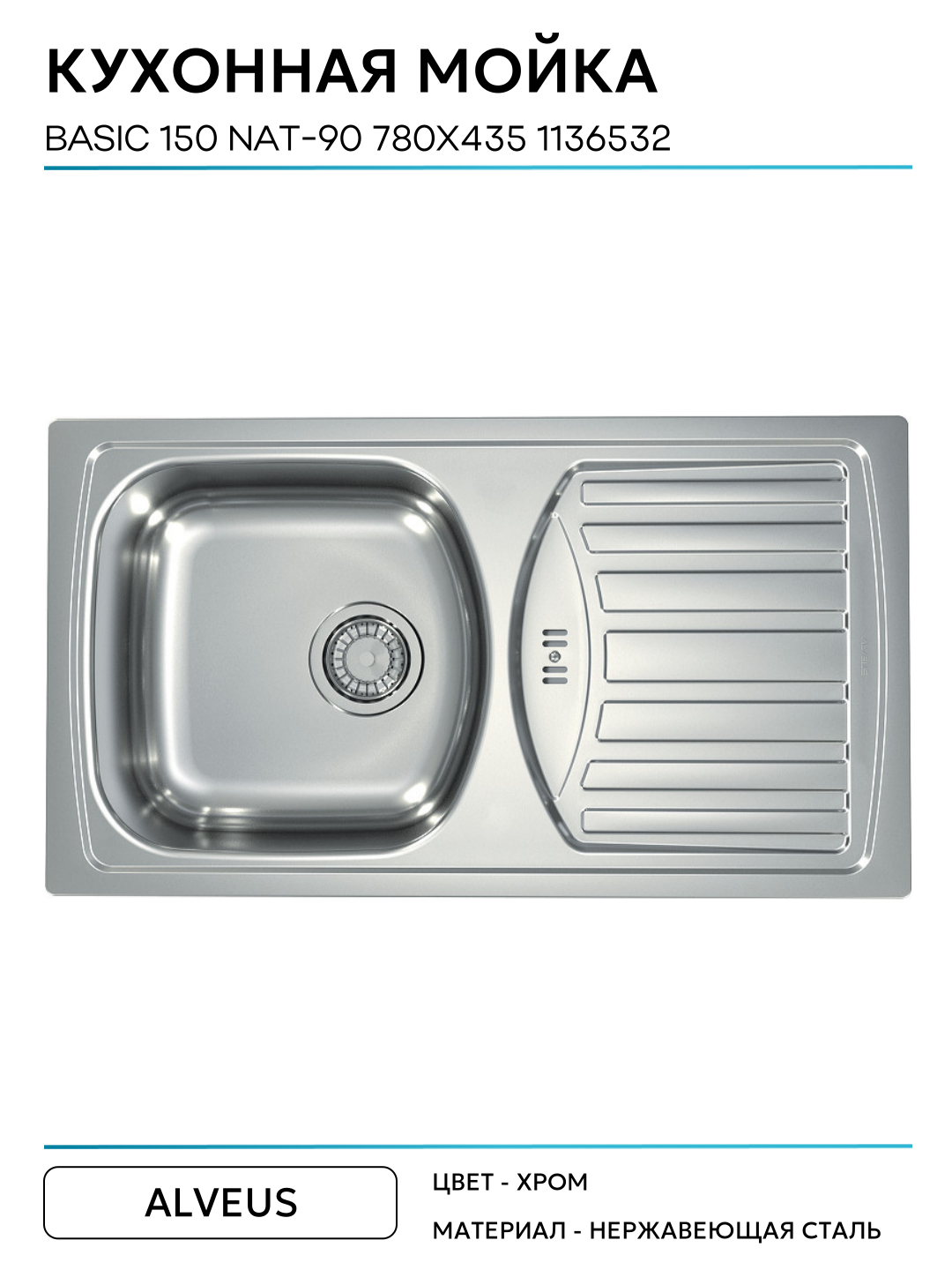 Купить Кухонная мойка Alveus Basic 150 NAT-90 780×435 1136532 Натуральная сталь нержавеющая сталь встраиваемый 78 с доставкой по всей России.