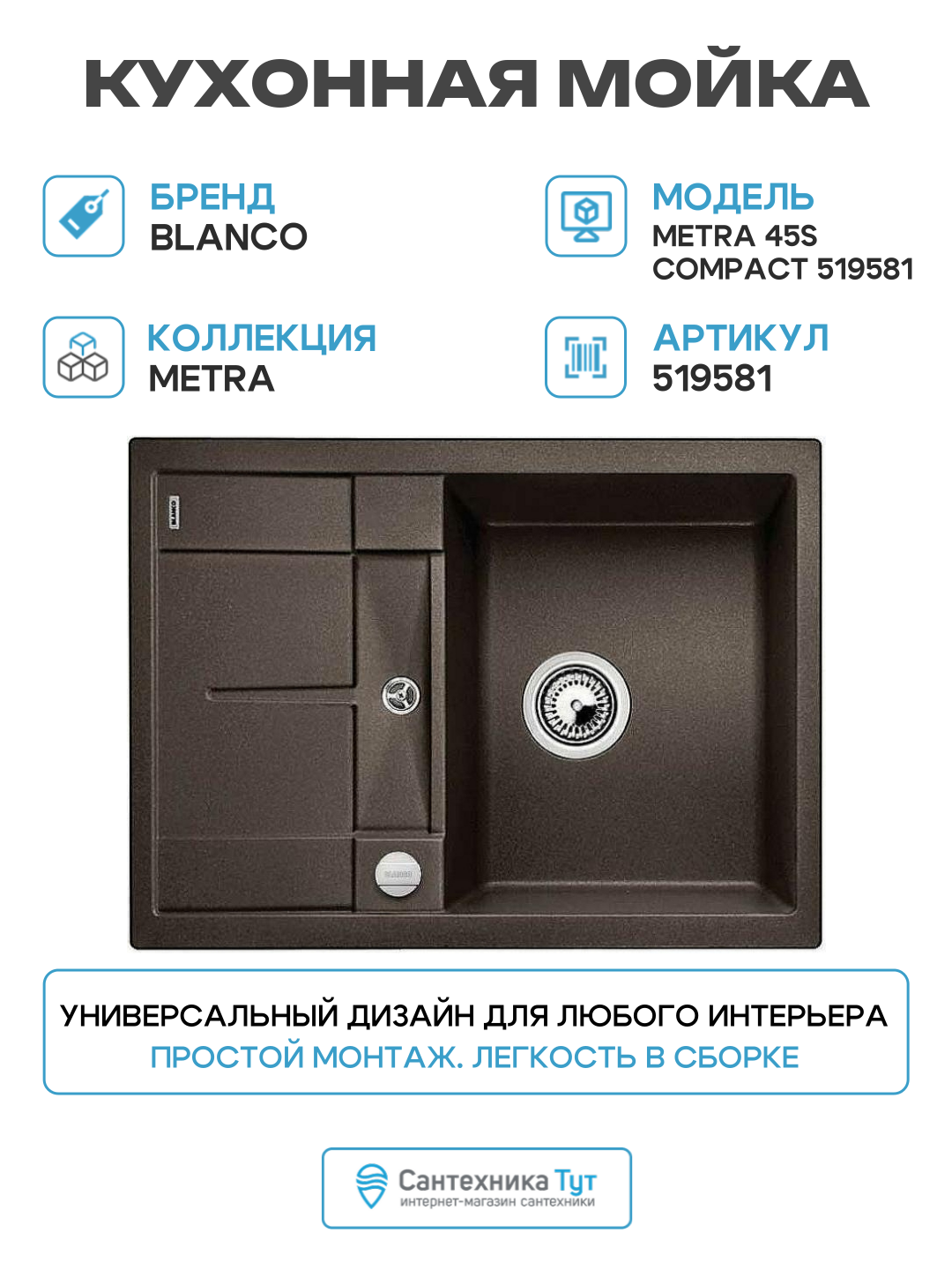 Кухонная мойка Blanco Metra 45S Compact 519581 Кофе искусственный камень встраиваемая сверху, встраиваемая снизу 68: сравнение цен, характеристики, фото, актуальное наличие и цены.