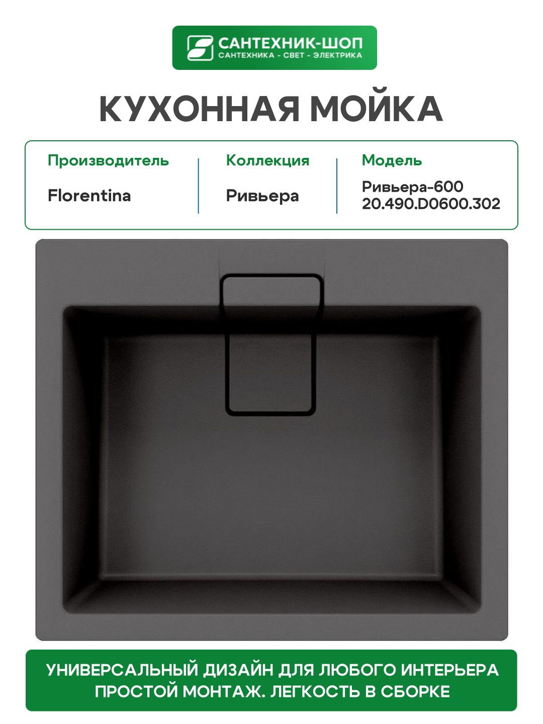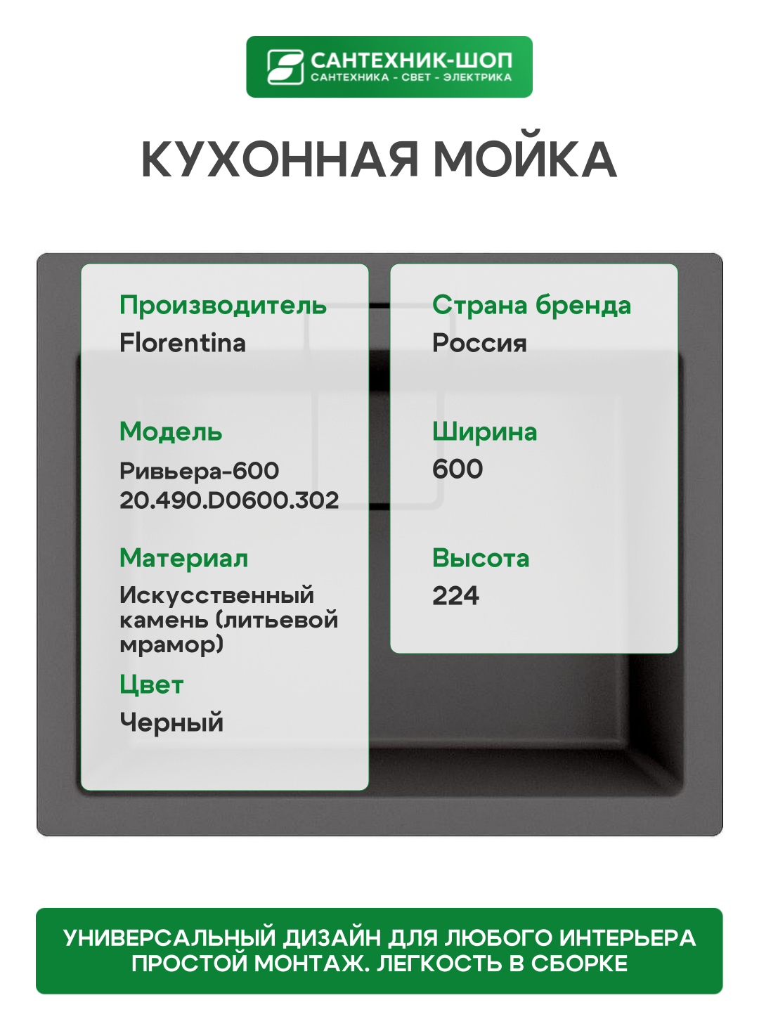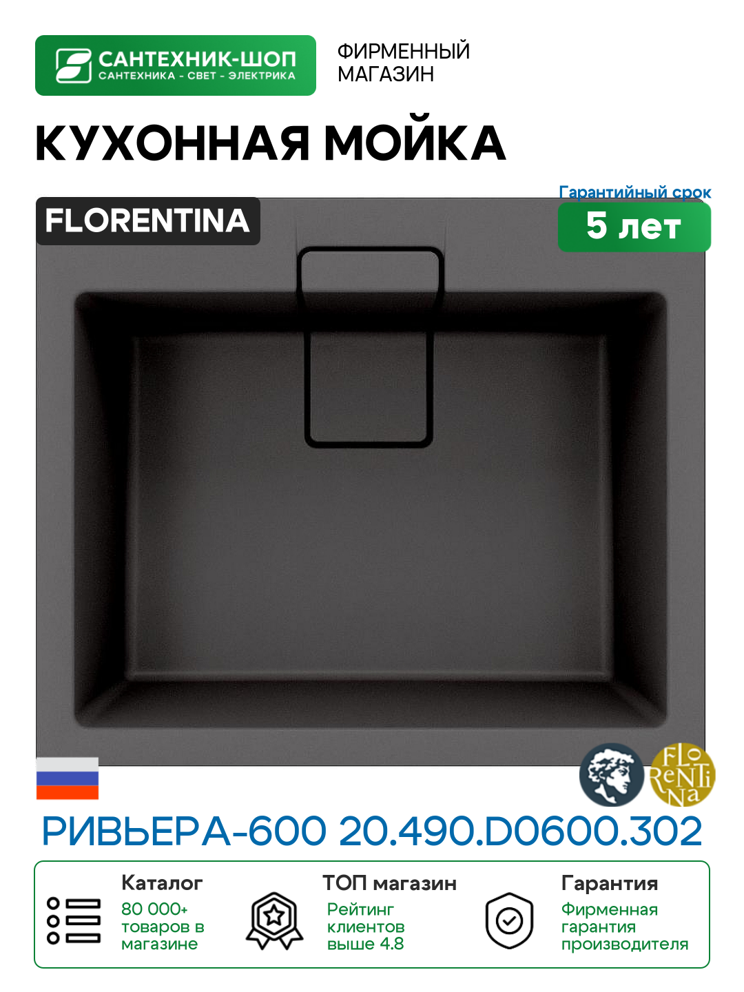 Кухонная мойка Florentina Ривьера-600 20.490. D0600.302 Антрацит искусственный камень (литьевой мрамор) встраиваемый: сравнение цен, характеристики, фото, актуальное наличие и цены.