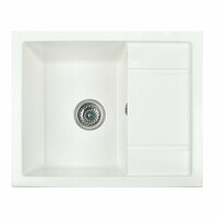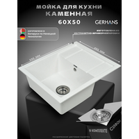 Глубокая каменная мойка GERHANS белого цвета с крылом. Размер врезной раковины для кухонного шкафа 595х495 (±5) мм. Высота глубокой чаши 200 мм. Мойка полуматовая. Исполнение врезной раковины оборачиваемое. Универсальная мойка может устанавливаться крылом как в левую, так и в правую стороны. Отметки для высверливания отверстия намечены с обратной стороны крыла белой мойки. Вам остается выбрать нужную сторону и просверлить отверстие. Отверстие рекомендуется делать алмазной коронкой, диаметром 35 мм. Свойства угловой раковины для кухни: - Выдерживает термоудар до 180 градусов (не боится кипятка);- Не впитывает пищевые красители;- Не обладает микропористой поверхностью;- Защита от микро-царапин;- Защита от ультрафиолета;- Защита от грибковых поражений;- Защита от запахов;- Пространственное армирование;- Низкое температурное расширение;- Каменная мойка укомплектована именно тем сифоном, изображение которого размещено в карточке товара. Сифон с отводом для подключения посудомоечной (стиральной) машины и гофро-трубой. Выпуск и корзинный клапан изготовлены из нержавеющей стали, комплектующие и винт - из никелированной латуни. Лаконичная угловая мойка со строгими линиями и крылом для сушки посуды станут не только функциональной деталью кухни, но и украсят Ваш интерьер. Крыло для сушки посуды с двумя глубокими желобами для слива воды обеспечит ее свободный слив за счет легкого наклона к чаше.