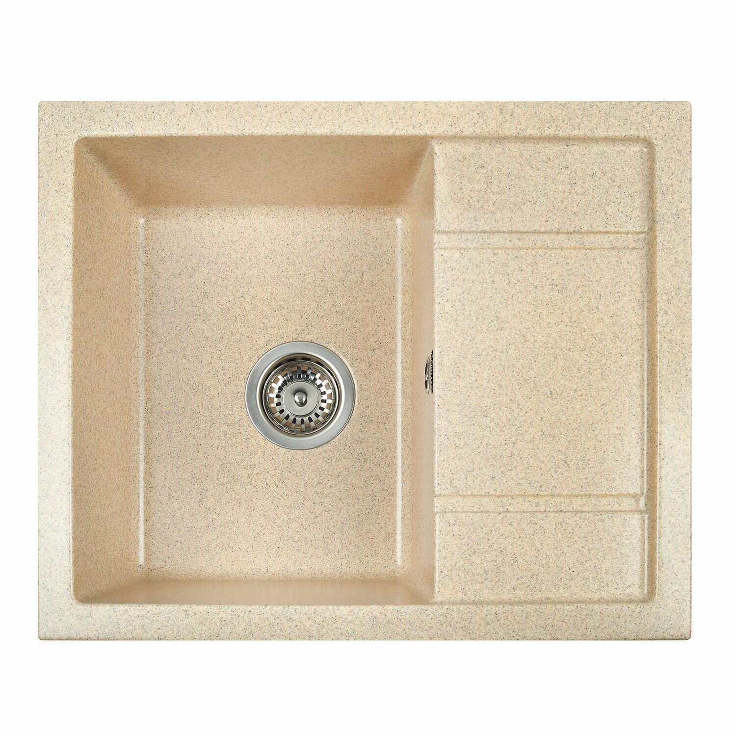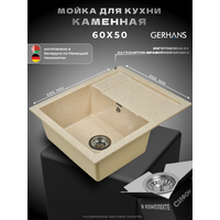 Глубокая каменная мойка GERHANS песочного цвета с крылом. Размер врезной раковины для кухонного шкафа 595х495 (±5) мм. Высота глубокой чаши 200 мм. Мойка полуматовая. Исполнение врезной раковины оборачиваемое. Универсальная мойка может устанавливаться крылом как в левую, так и в правую стороны. Отметки для высверливания отверстия намечены с обратной стороны крыла песочной мойки. Вам остается выбрать нужную сторону и просверлить отверстие. Отверстие рекомендуется делать алмазной коронкой, диаметром 35 мм. Свойства угловой раковины для кухни: - Выдерживает термоудар до 180 градусов (не боится кипятка);- Не впитывает пищевые красители;- Не обладает микропористой поверхностью;- Защита от микро-царапин;- Защита от ультрафиолета;- Защита от грибковых поражений;- Защита от запахов;- Пространственное армирование;- Низкое температурное расширение;- Каменная мойка укомплектована именно тем сифоном, изображение которого размещено в карточке товара. Сифон с отводом для подключения посудомоечной (стиральной) машины и гофро-трубой. Выпуск и корзинный клапан изготовлены из нержавеющей стали, комплектующие и винт - из никелированной латуни. Лаконичная угловая мойка со строгими линиями и крылом для сушки посуды станут не только функциональной деталью кухни, но и украсят Ваш интерьер. Крыло для сушки посуды с двумя глубокими желобами для слива воды обеспечит ее свободный слив за счет легкого наклона к чаше.