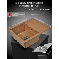 Глубокая каменная мойка GERHANS цвета терракот с крылом. Размер врезной раковины для кухонного шкафа 595х495 (±5) мм. Высота глубокой чаши 200 мм. Мойка полуматовая. Исполнение врезной раковины оборачиваемое. Универсальная мойка может устанавливаться крылом как в левую, так и в правую стороны. Отметки для высверливания отверстия намечены с обратной стороны крыла терракотовой мойки. Вам остается выбрать нужную сторону и просверлить отверстие. Отверстие рекомендуется делать алмазной коронкой, диаметром 35 мм. Свойства угловой раковины для кухни: - Выдерживает термоудар до 180 градусов (не боится кипятка);- Не впитывает пищевые красители;- Не обладает микропористой поверхностью;- Защита от микро-царапин;- Защита от ультрафиолета;- Защита от грибковых поражений;- Защита от запахов;- Пространственное армирование;- Низкое температурное расширение;- Каменная мойка укомплектована именно тем сифоном, изображение которого размещено в карточке товара. Сифон с отводом для подключения посудомоечной (стиральной) машины и гофро-трубой. Выпуск и корзинный клапан изготовлены из нержавеющей стали, комплектующие и винт - из никелированной латуни. Лаконичная угловая мойка со строгими линиями и крылом для сушки посуды станут не только функциональной деталью кухни, но и украсят Ваш интерьер. Крыло для сушки посуды с двумя глубокими желобами для слива воды обеспечит ее свободный слив за счет легкого наклона к чаше.