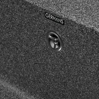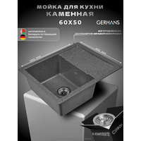 Глубокая каменная мойка GERHANS цвета графит с крылом. Размер врезной раковины для кухонного шкафа 595х495 (±5) мм. Высота глубокой чаши 200 мм. Мойка полуматовая. Исполнение врезной раковины оборачиваемое. Универсальная мойка может устанавливаться крылом как в левую, так и в правую стороны. Отметки для высверливания отверстия намечены с обратной стороны крыла серой мойки. Вам остается выбрать нужную сторону и просверлить отверстие. Отверстие рекомендуется делать алмазной коронкой, диаметром 35 мм. Свойства угловой раковины для кухни: - Выдерживает термоудар до 180 градусов (не боится кипятка);- Не впитывает пищевые красители;- Не обладает микропористой поверхностью;- Защита от микро-царапин;- Защита от ультрафиолета;- Защита от грибковых поражений;- Защита от запахов;- Пространственное армирование;- Низкое температурное расширение;- Каменная мойка укомплектована именно тем сифоном, изображение которого размещено в карточке товара. Сифон с отводом для подключения посудомоечной (стиральной) машины и гофро-трубой. Выпуск и корзинный клапан изготовлены из нержавеющей стали, комплектующие и винт - из никелированной латуни. Лаконичная угловая мойка со строгими линиями и крылом для сушки посуды станут не только функциональной деталью кухни, но и украсят Ваш интерьер. Крыло для сушки посуды с двумя глубокими желобами для слива воды обеспечит ее свободный слив за счет легкого наклона к чаше.