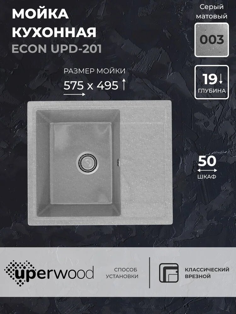 Кухонная мойка из искусственного камня Uperwood ECON UPD-201-003, прямоугольная, серая матовая: сравнение цен, характеристики, фото, актуальное наличие и цены.