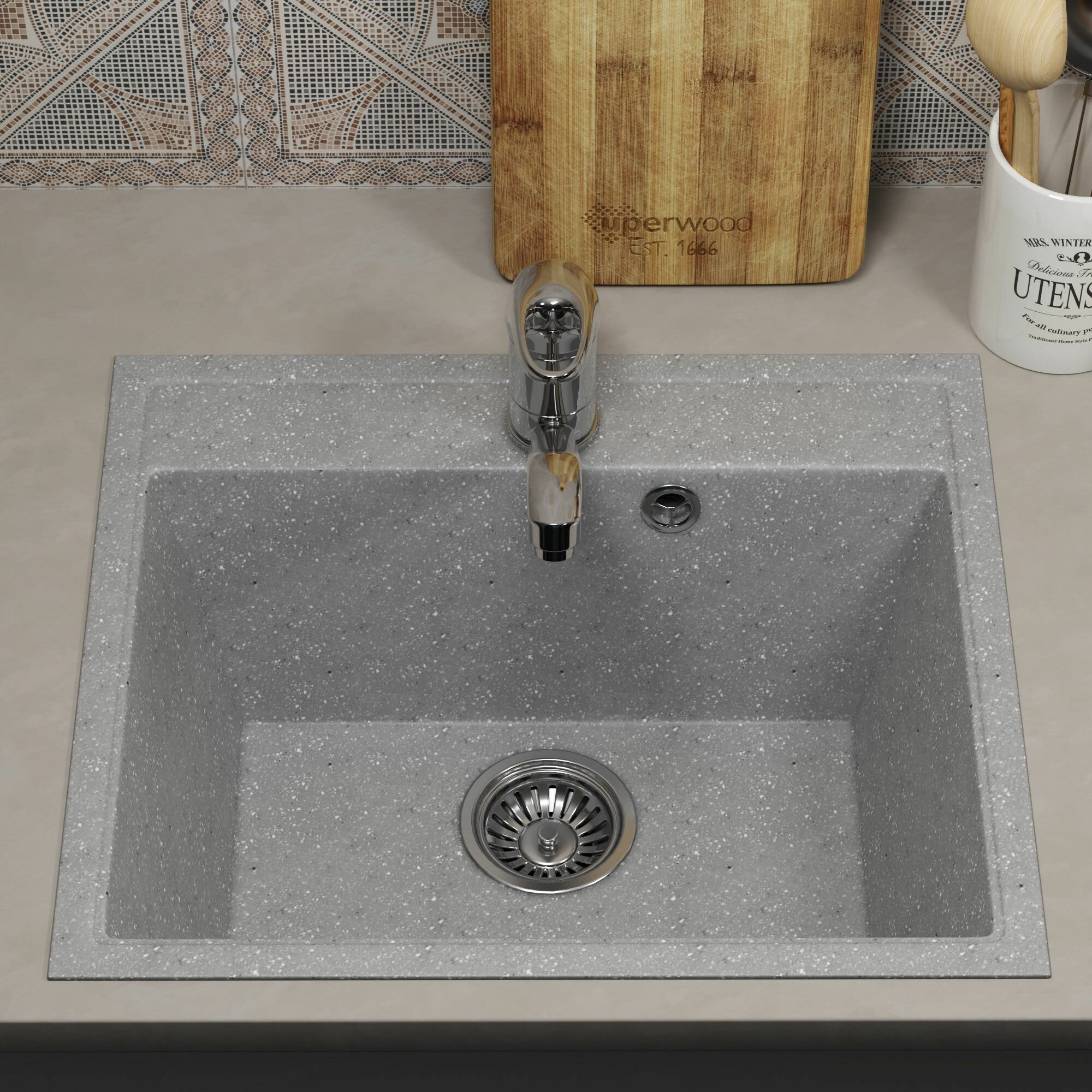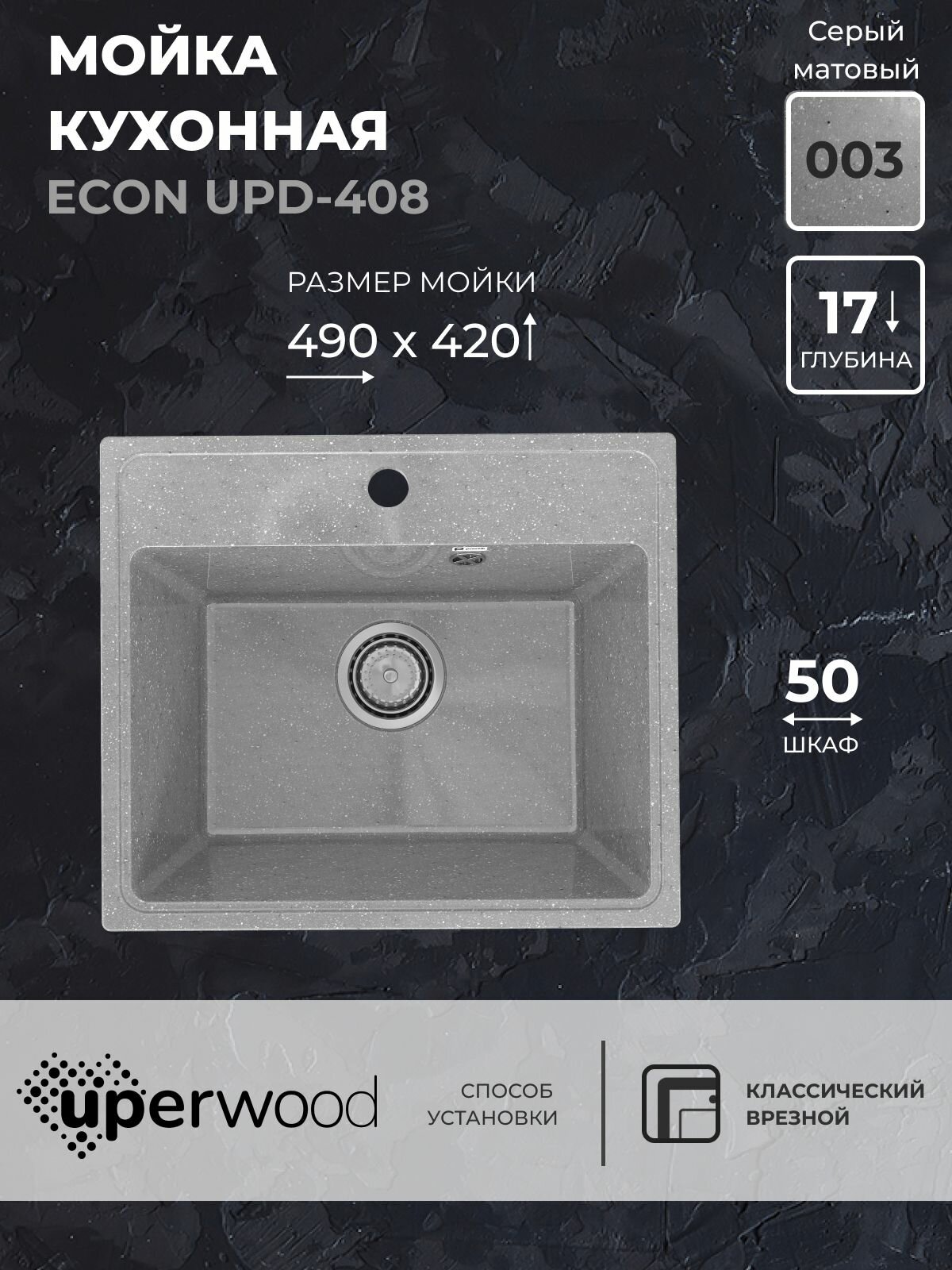 Купить Кухонная мойка из искусственного камня Uperwood ECON UPD-408-003, прямоугольная, серая матовая с доставкой по всей России.